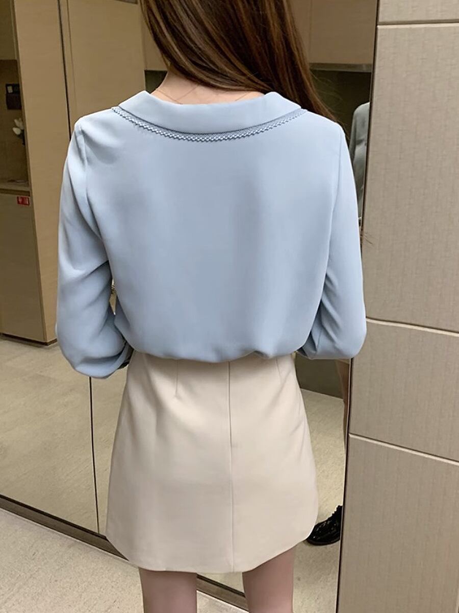 全2色 パールボタンシャツブラウス シャツ ブラウス 飾りボタン 長袖 ボリューム袖 ふんわり袖 パフスリーブ 襟 丸襟 縁飾り 萌袖 シフォン オフィスコーデ かわいい 大人可愛い きれいめ シンプル カジュアル 上品 おしゃれ かっこいい レトロ こなれ感 ラブリー キュート 個性的 モード系 エレガント モダン 主役級 存在感 抜け感 レディース OL お出かけ 女子会 韓国コーデ 韓国ファション 青 ブルー ホワイト 白
