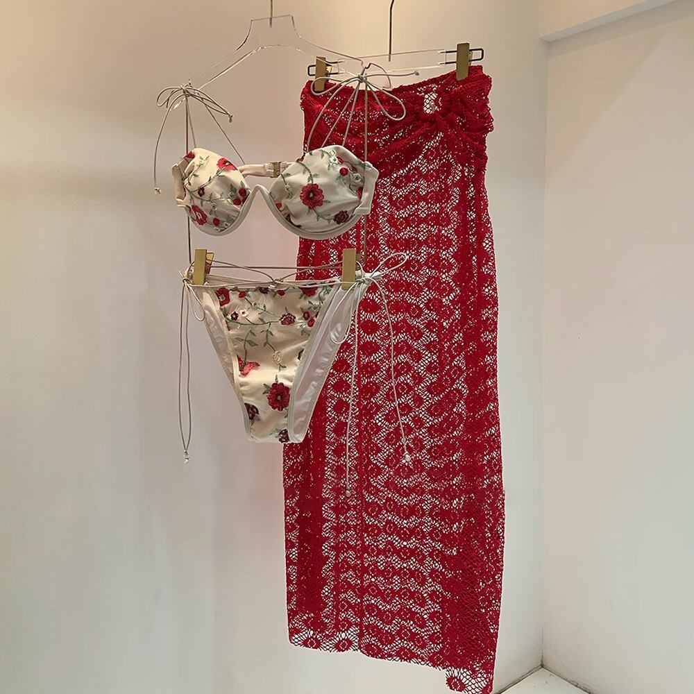 3点セット オーバーレース花柄刺繍ビキニ上下+ロングスカート レース 花柄 小花柄 タイサイド風 アイボリー アプリコット 赤 レッド グリーン 緑 飾り紐 紐ビキニ風 ビキニ セクシー 高級感 高見え かわいい パッド付き ワイヤーあり ワイヤーつき サマーニット ニットスカート かぎ針編み セット かわいい 大人可愛い きれいめ sexy 華やか おしゃれ スタイリッシュ 美脚 脚長 韓国コーデ 韓国ファション
