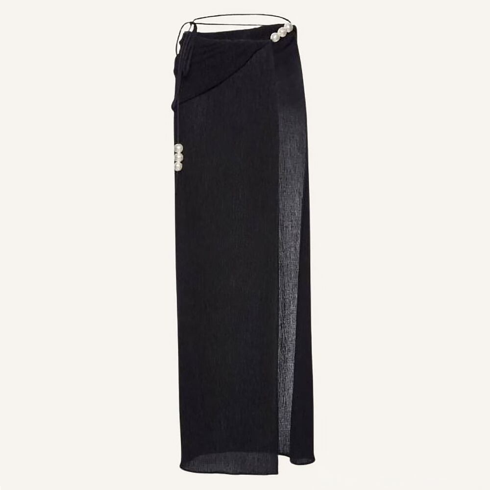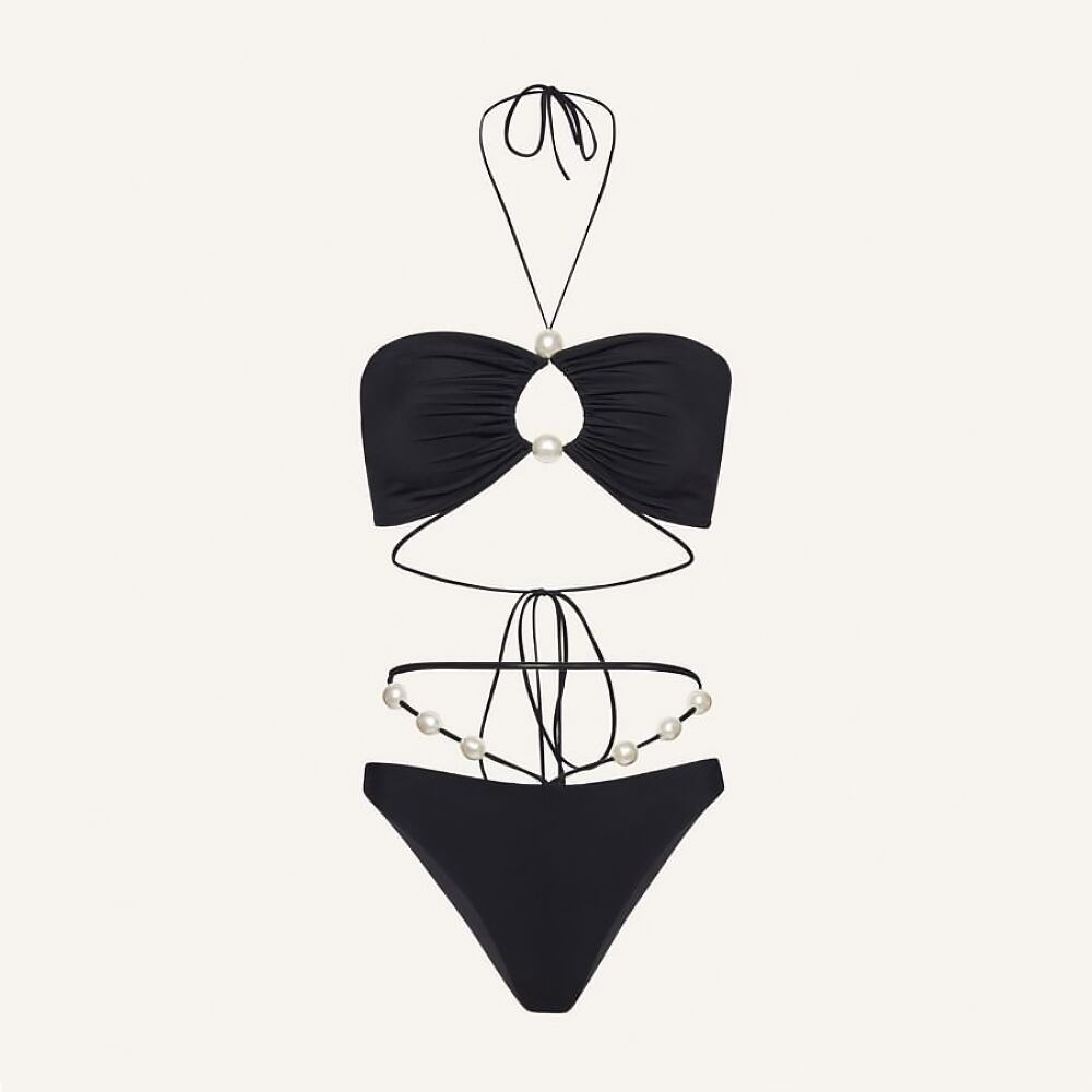 大きめのパールビーズが華やかにみせるホルターネックビキニ上下とロングスカートの3点セットです。