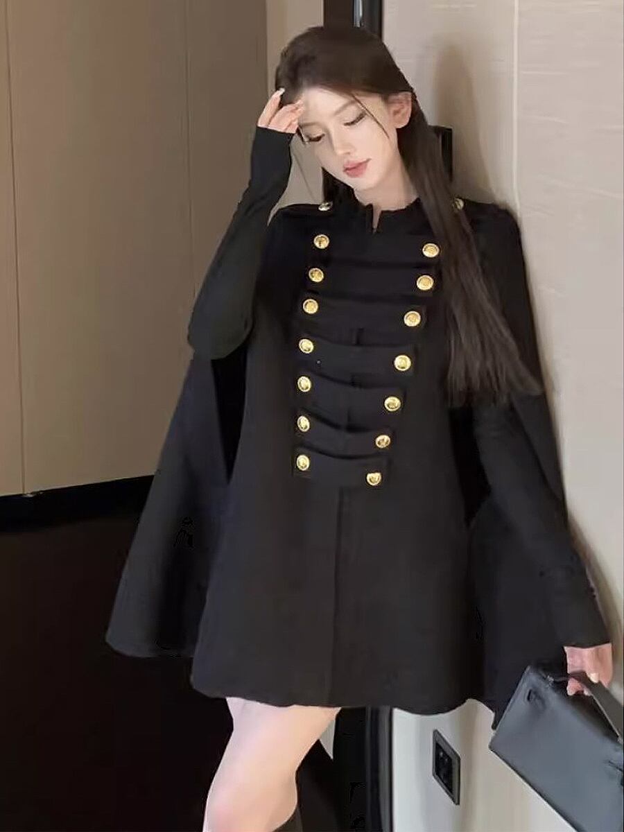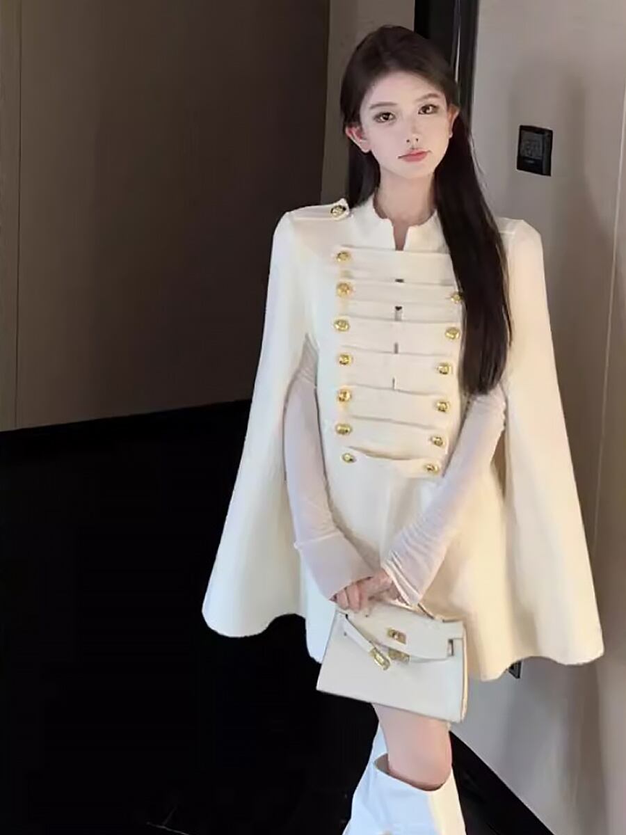 全2色 ゴールドボタンケープコート ケープ コート アウター マント 羽織り ポンチョ 英国風 クラシカル 衿なし スタンドカラー 前開き 飾りボタン カジュアル 大人 上品 おしゃれ お洒落 ゆったり ゆる かっこいい こなれ感 楽ちん ショートコート ゴールドボタン コーデ 重ね着 体型カバー ファッション 主役級 存在感 抜け感 秋 冬 レディース 通勤 学生 通学 デート お出かけ 防寒 韓国コーデ 韓国ファッション 白 ホワイト 黒 ブラック