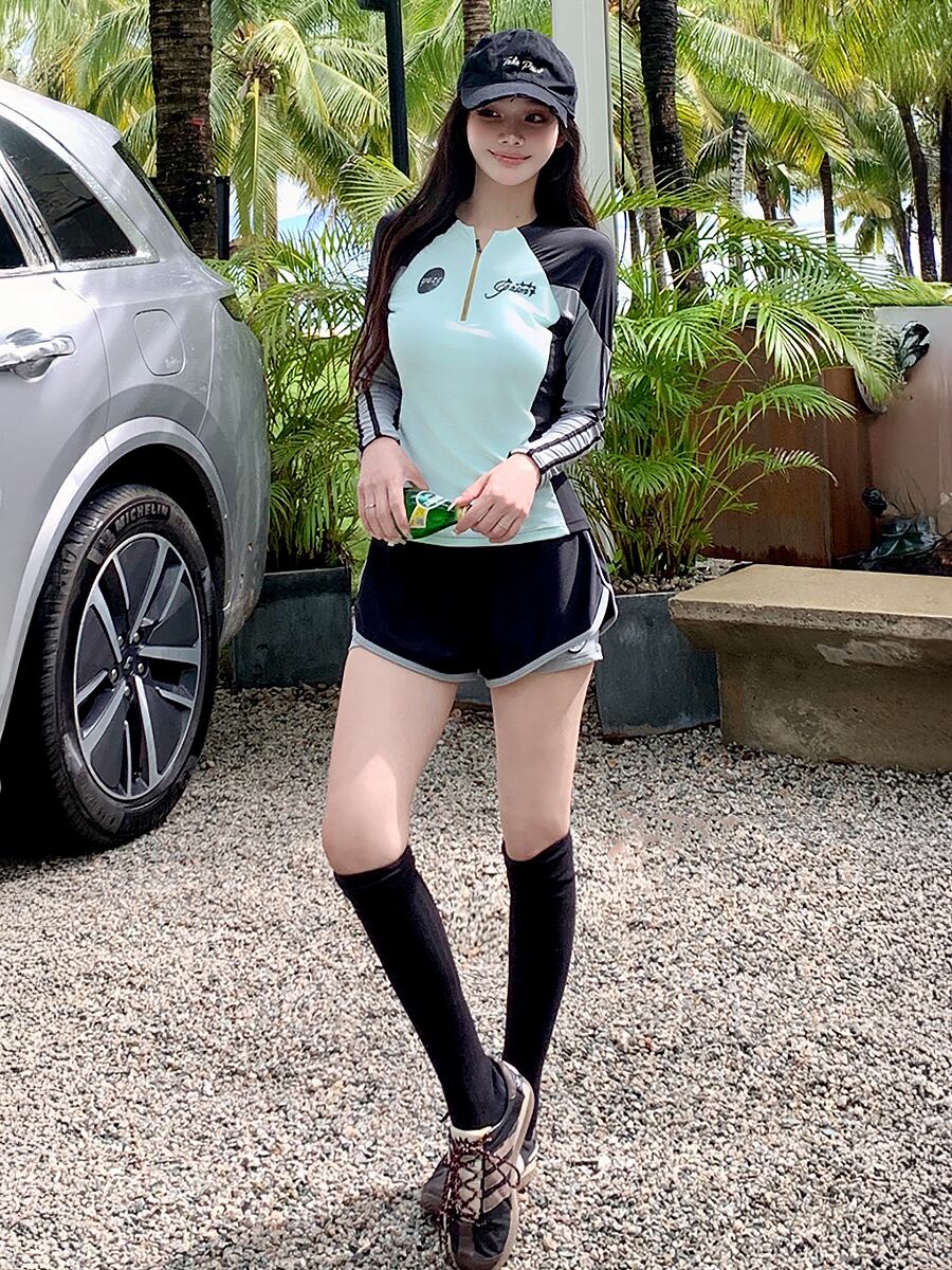 水着 長袖ビキニ スポーティセパレート水着 ツーピース ビキニ セパレート 長袖 ラッシュガード水着 ハーフジップアップ ショートパンツ フレア フィットネス ドッキングショートパンツ フェイクショートパンツ ミントグリーン ブラック グレー ラッシュガード 二の腕カバー 体型カバー スポーティ 水遊び きれいめ フェミニン かわいい パッド付き ワイヤーなし 伸縮性 セット 上下セット かわいい 大人可愛い きれいめ セクシー おしゃれ スタイリッシュ スイムウェア