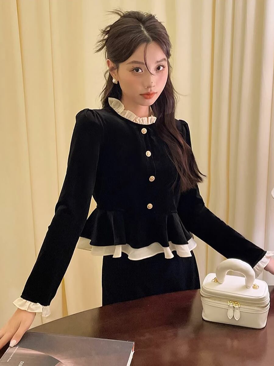 2点セット 上下セット ツーピース セットアップ へプラムベロアトップス+ベロアロングスカート レース ブラックワンピ ハイウエスト ウエストフリル フリル 金ボタン きれいめ 清楚 ミモレ セットアップ 長袖 ミモレ丈 レトロ きれいめ 大人っぽい かわいい 大人可愛い カジュアルパーティ デート カジュアル 大人 上品 おしゃれ お洒落 大人女子 こなれ感 レディース お出かけ お呼ばれ 発表会 着回し モテ 韓国コーデ 韓国ファッション 黒 ブラック