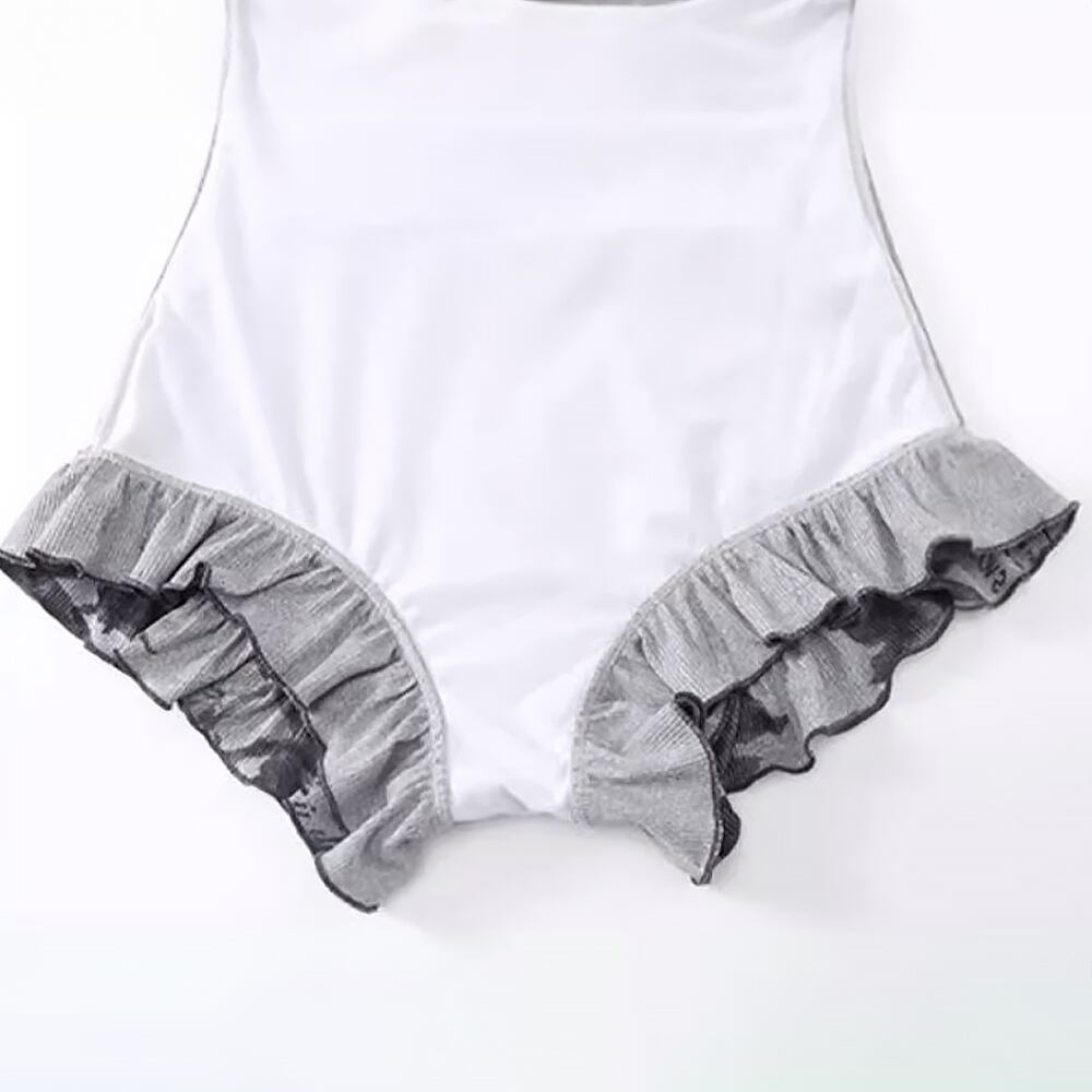 2点セット 水着 モノクロ花モチーフワンピース+ボレロ風ラッシュガード フリルワンピース水着 フリル レース 裾フリル 露出少なめ 露出控えめ ラッシュガード 被り物 長袖ラッシュガード 体型カバー シャーリング 長袖 シースルー スイムウェア パッド付き ワイヤーなし かわいい レディース 着痩せ スタイルアップ 美スタイル 韓国 韓国系 オルチャン 韓国コーデ 韓国ファッション 白黒 モノクローム グレー 灰色