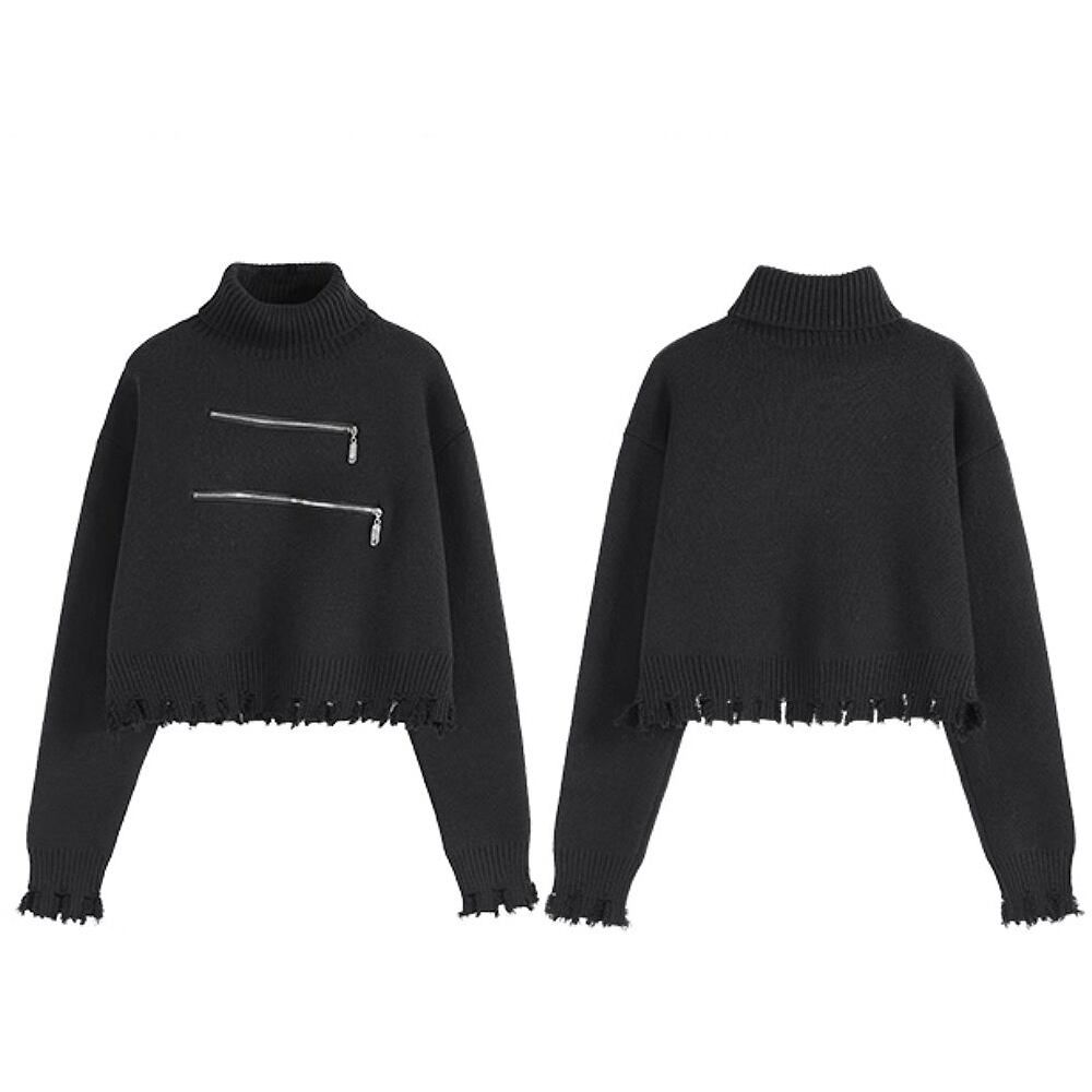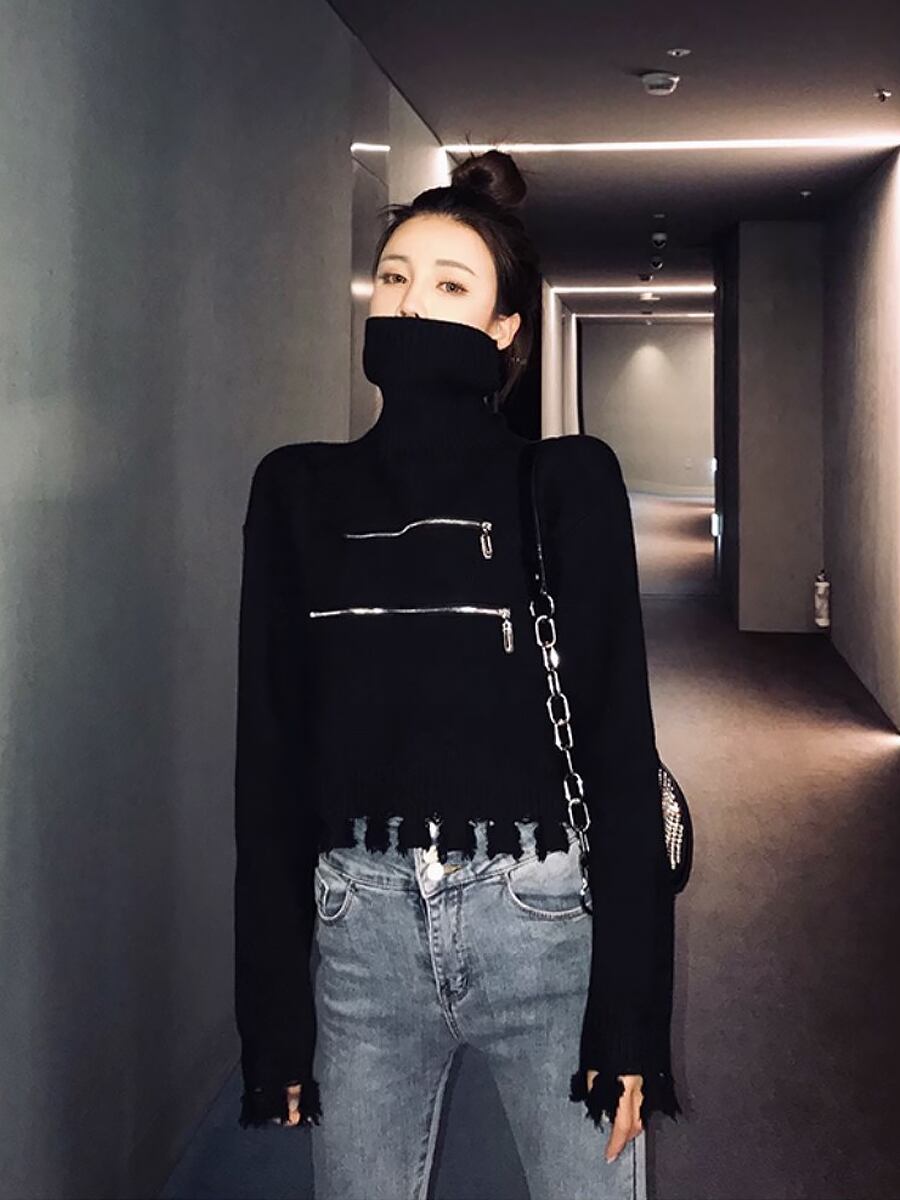 ショート丈クロップドジップデザイン長袖ニット タートルネック ハイネック ジップ ジッパー ファスナー ニット プルオーバー トップス かわいい 大人可愛い きれいめ きちんと感 カジュアル おしゃれ お洒落 レトロ 大人女子 こなれ感 ラブリー キュート ガーリー 個性的 モダン 主役級 存在感 抜け感 無地 デート お出かけ 女子会 休日 着回し 普段使い 韓国ファッション 韓国コーデ カーキ ブラック 黒
