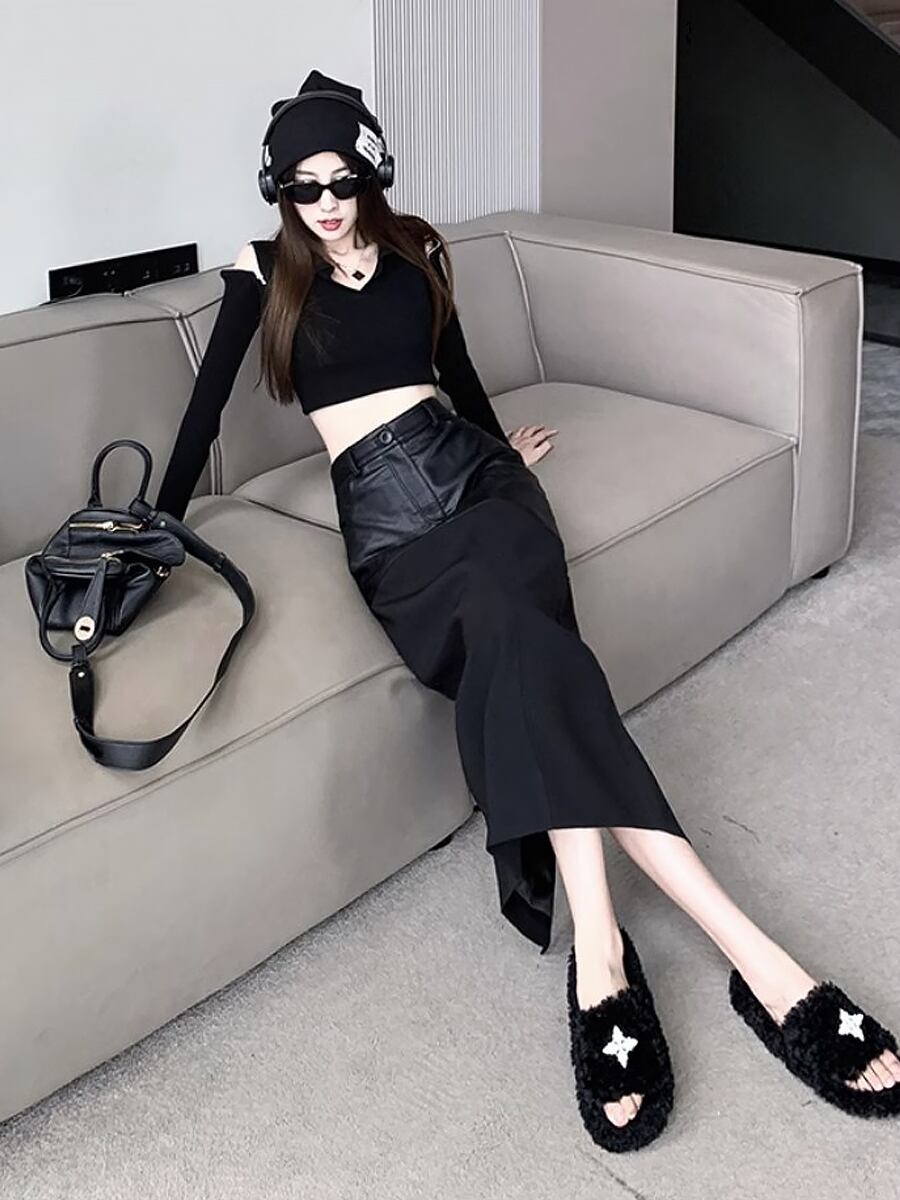 ドッキング異素材ロングタイトスカート PUレザー ウール バックスリット タイトスカート 歩きやすい ロングスカート 秋冬 あったか ハイウエスト スカート フェミニン かわいい 大人可愛い きれいめ シンプル カジュアル 上品 おしゃれ かっこいい レトロ こなれ感 ラブリー キュート 楽ちん 個性的 モード系 エレガント モダン 主役級 存在感 抜け感 柄 レディース 着回し お出かけ 韓国コーデ 韓国ファション 黒 ブラック