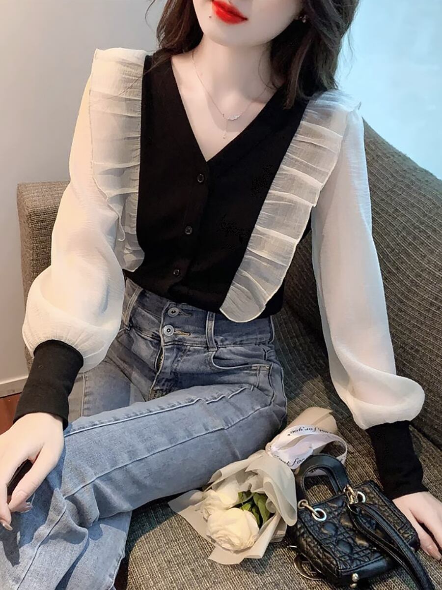 バイカラードッキングVネックブラウス Vネック ブラウス 前ボタン 異素材 パフスリーブ バルーンスリーブ 長袖 シャツブラウス 袖あり フェミニン かわいい 大人可愛い きれいめ カジュアル 清楚 上品 おしゃれ お洒落 大人女子 こなれ感 エレガント モダン イベント レディース 通勤 通学 デート お出かけ 韓国コーデ 韓国ファッション 黒 白 ホワイト ブルー 無地 お出かけ