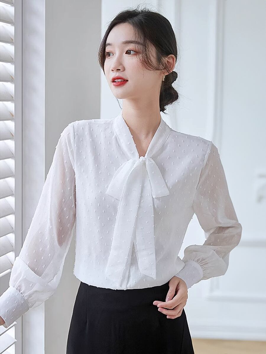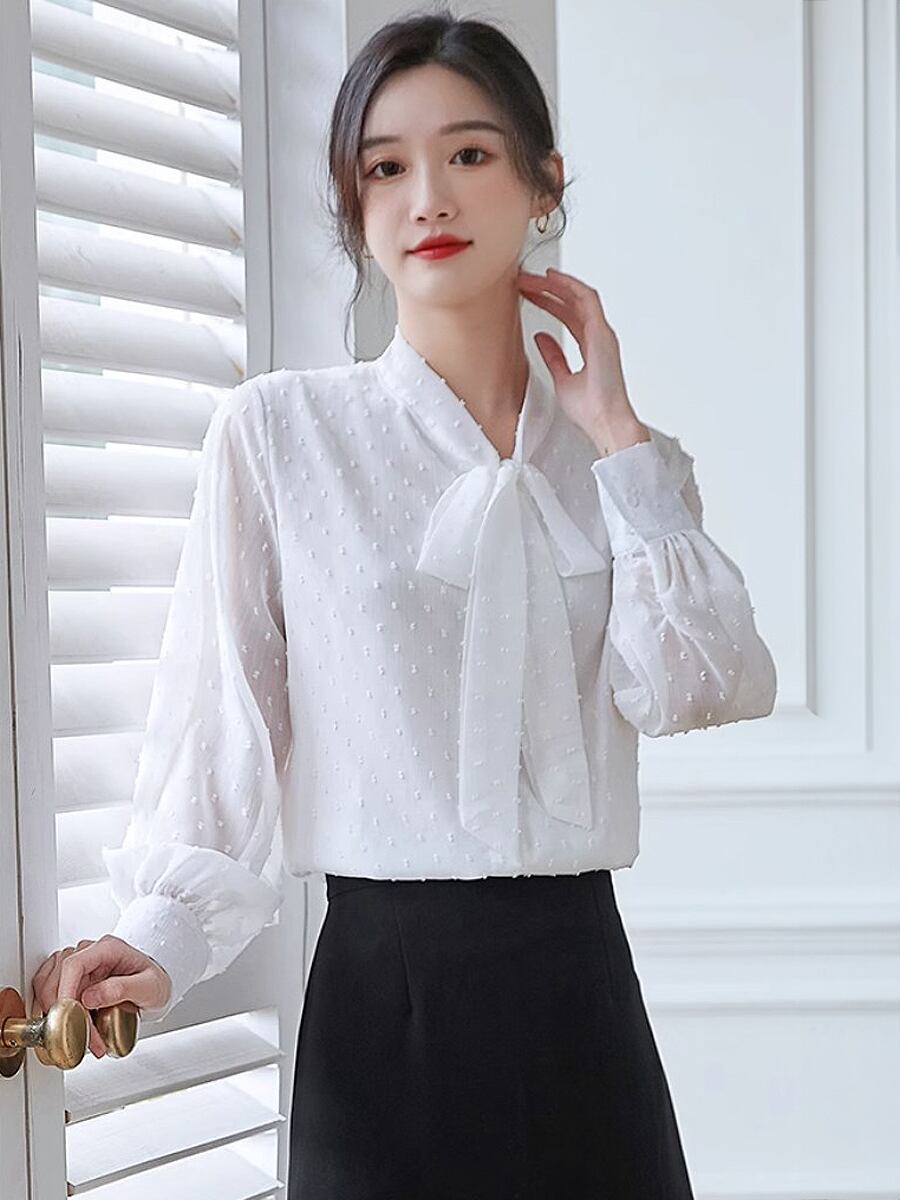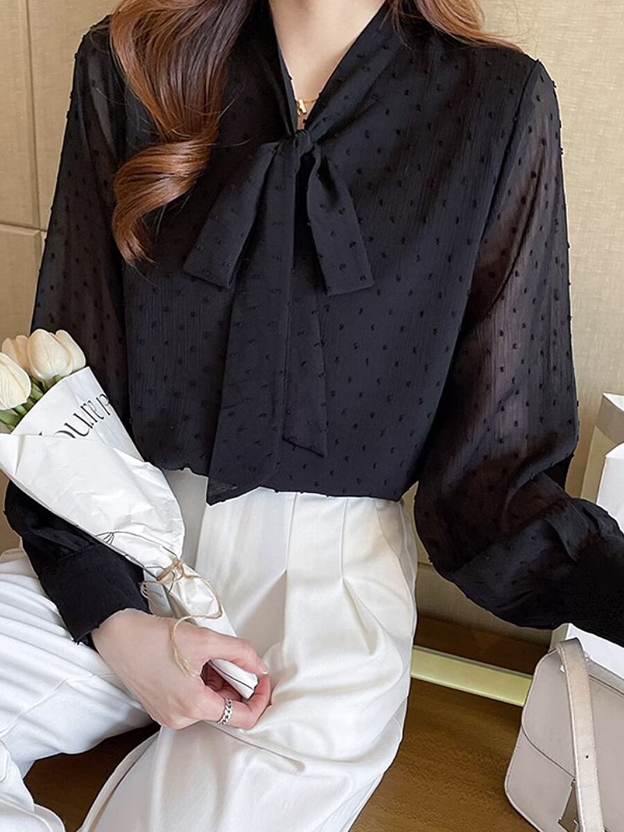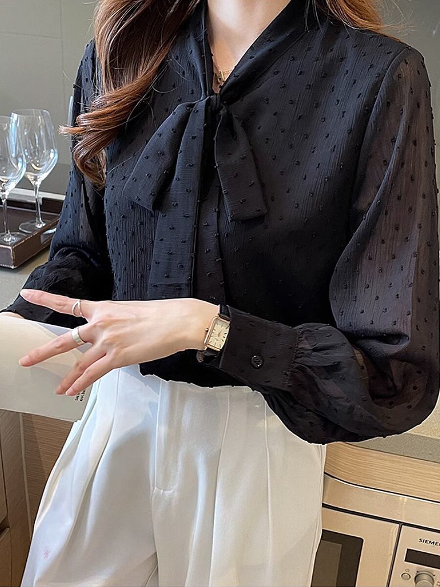 全2色 ドット柄長袖ボウタイブラウス リボン ボウタイ ドット ブラウス リボンタイ パフスリーブ バルーンスリーブ 長袖 シャツブラウス 袖あり フェミニン かわいい 大人可愛い きれいめ カジュアル 清楚 上品 おしゃれ お洒落 大人女子 こなれ感 エレガント モダン イベント レディース 通勤 通学 デート お出かけ 韓国コーデ 韓国ファッション 黒 白 ホワイト ブラック お出かけ