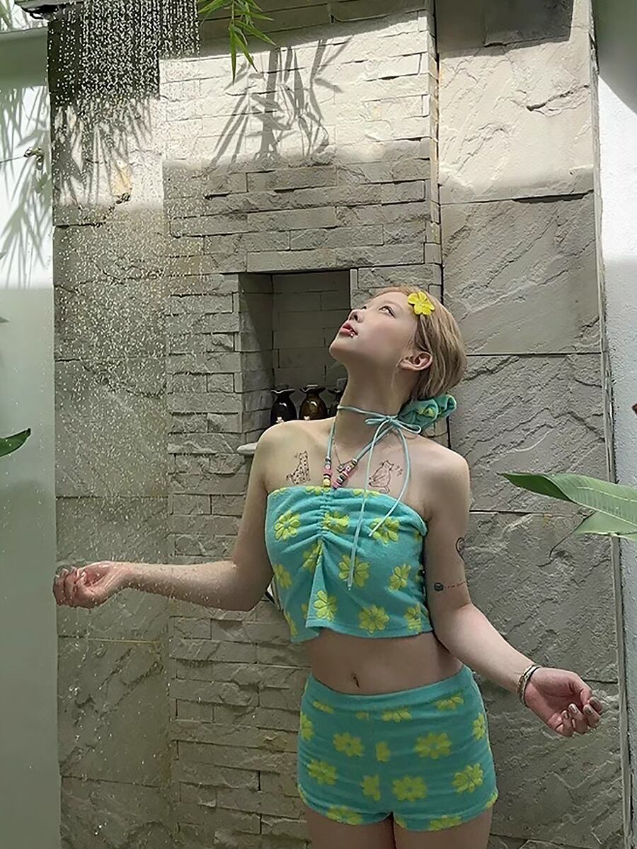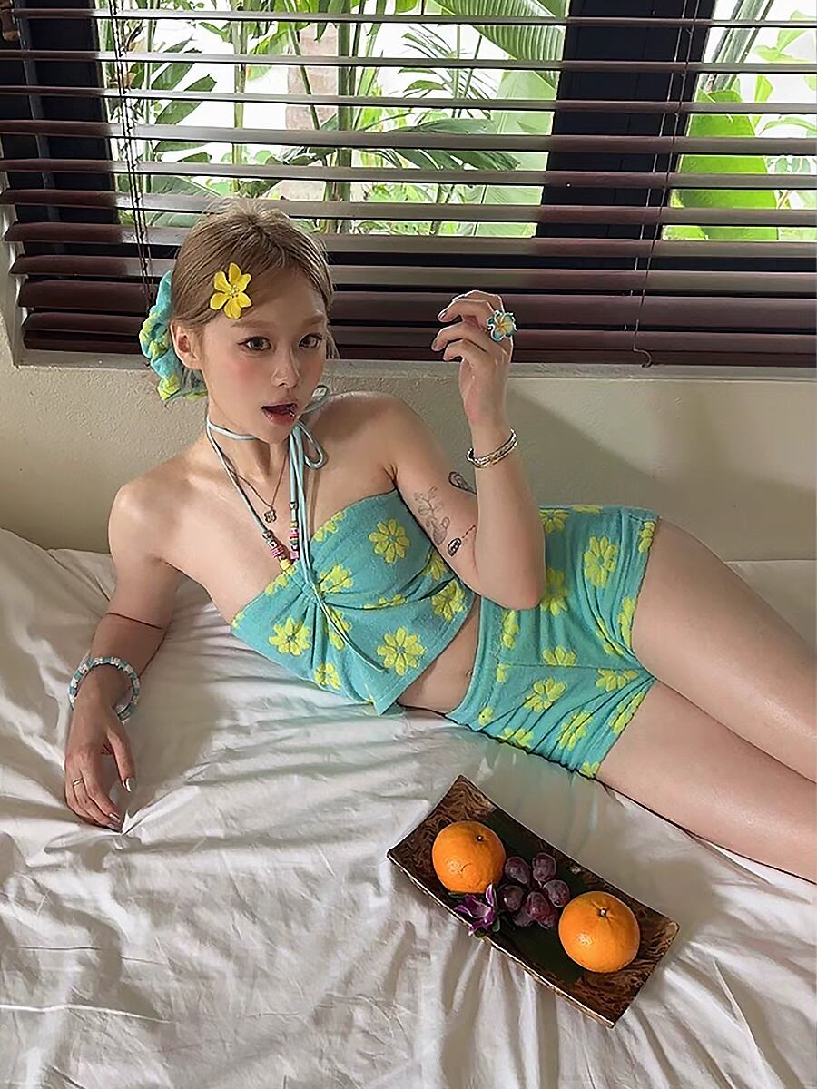 水着 ビキニ タンキニ タオル生地ホルターネックビキニ 花柄 グリーン エメラルドグリーン ターコイズ ターコイズグリーン ホルターネック ボーイレッグ ガーリー レトロ フェミニン デイジー柄 かわいい 体型カバー パッド付き ノンワイヤー ワイヤーなし スポーティ 水遊び 大人可愛い きれいめ セクシー sexy 華やか おしゃれ スタイリッシュ 美脚 脚長 韓国コーデ 韓国ファション