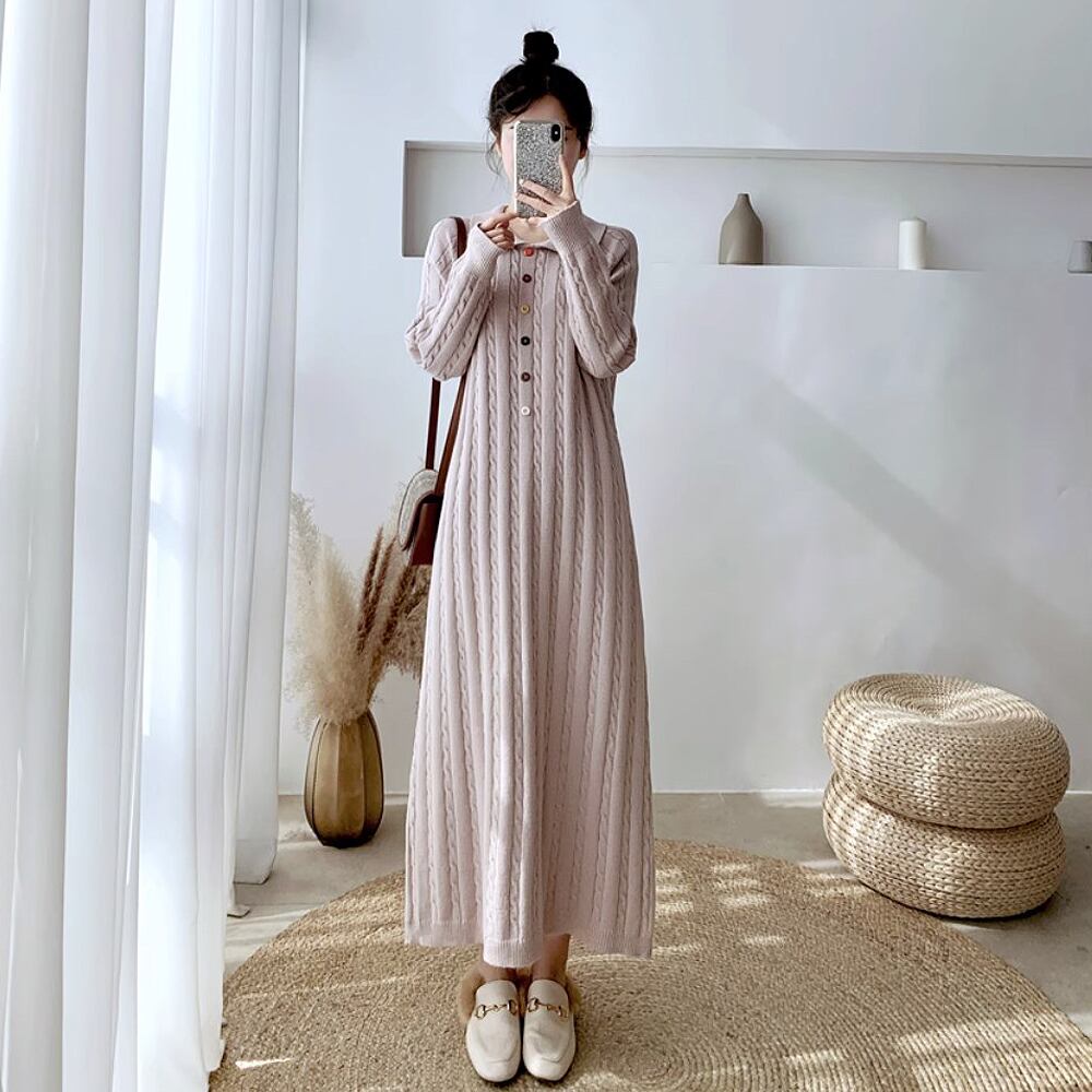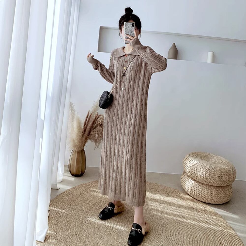 全3色 マルチカラーボタンケーブル編みニットワンピース 長袖 ロング 長袖ワンピース ニットワンピース 襟付き ポロ襟 ニット 縄編み ペンシルライン Iライン ミモレ ロング 大きめ かわいい 大人可愛い きれいめ カジュアル おしゃれ お洒落 レトロ 大人女子 こなれ感 ラブリー キュート ガーリー 個性的 モダン 主役級 存在感 抜け感 デート お出かけ 女子会 休日 着回し 普段使い 韓国ファッション アプリコット キャメル グレー
