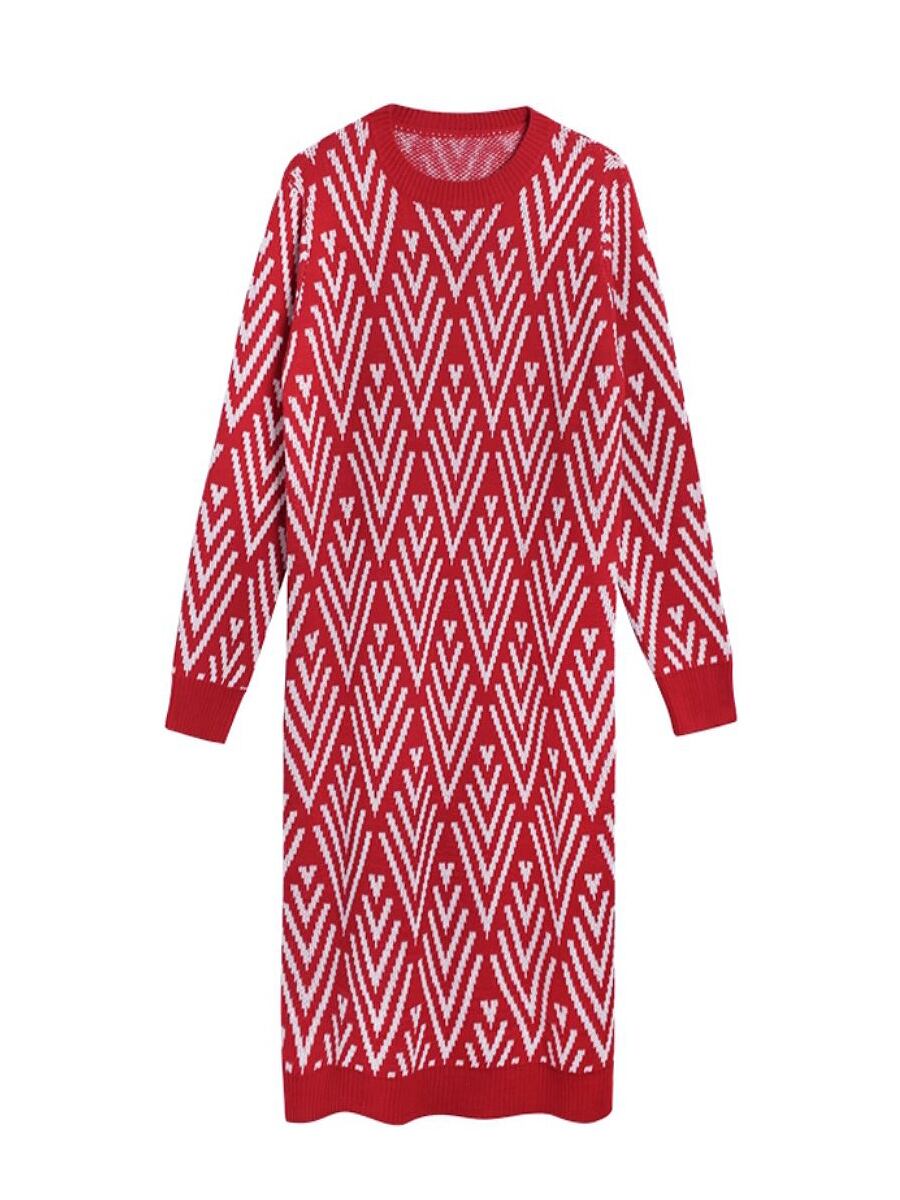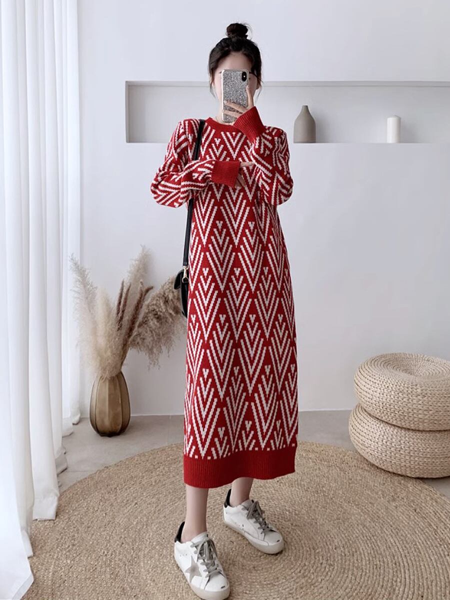 全2色 ギザギザ模様ニットワンピース 長袖 長袖ワンピース ラウンドネック 丸首 秋冬 Iライン ペンシルライン ソフトタッチ シンプル あったか ロング 変則シマシマ かわいい 大人可愛い きれいめ カジュアル おしゃれ お洒落 レトロ 大人女子 こなれ感 ラブリー キュート ガーリー 個性的 モダン 主役級 存在感 抜け感 デート お出かけ 女子会 休日 着回し 普段使い 韓国ファッション 赤 黒