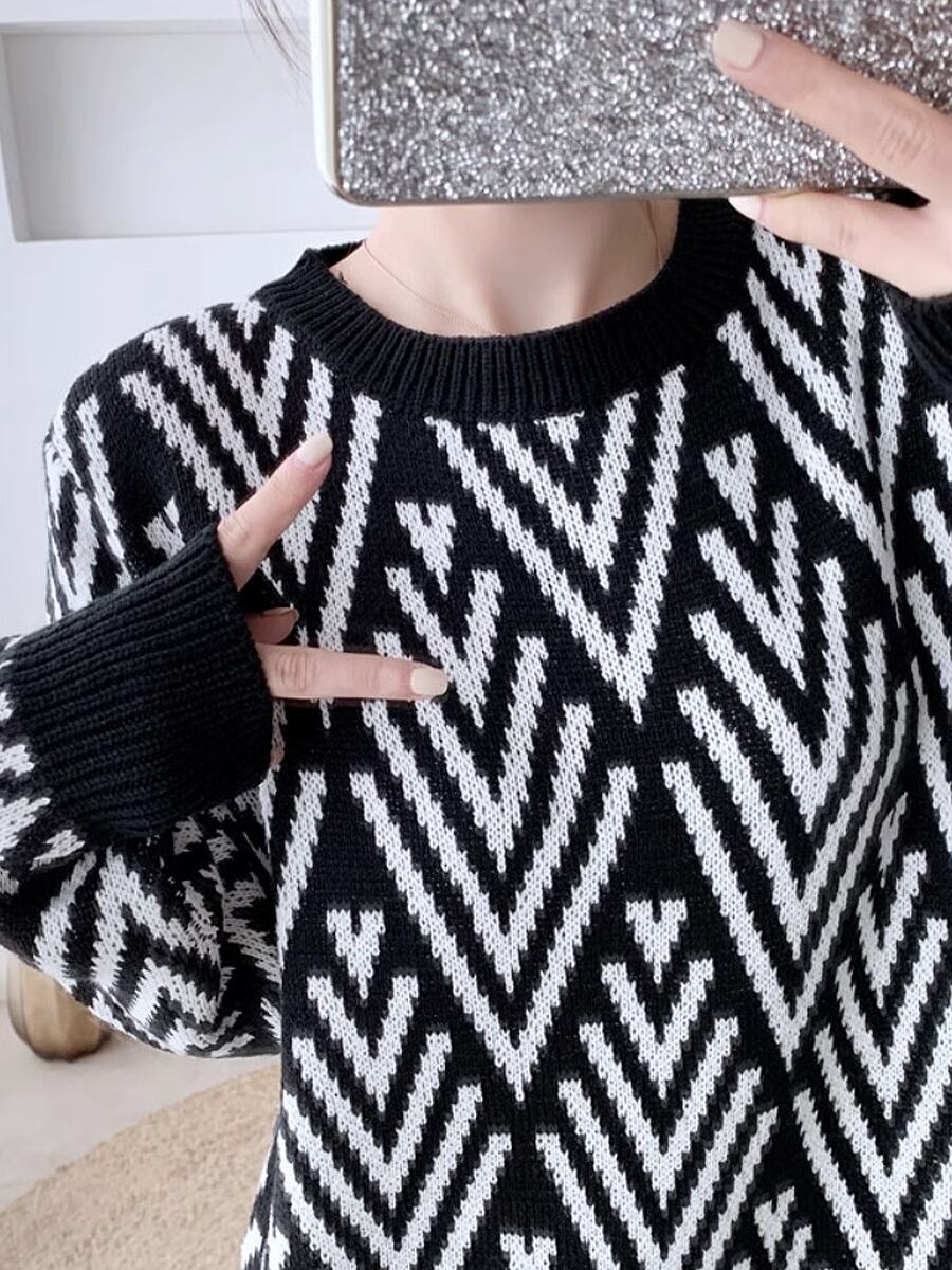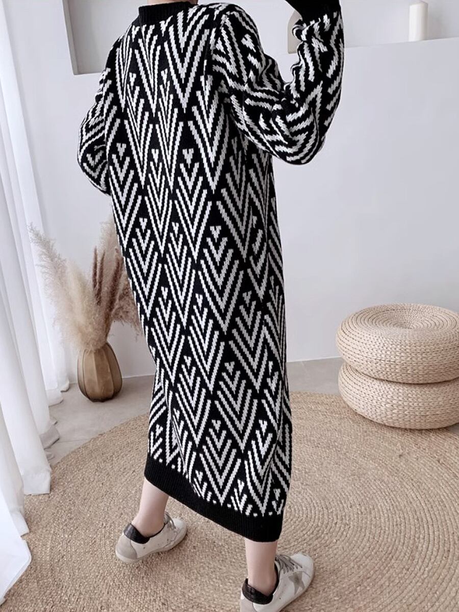ギザギザ模様のシャープな鋭角が細見えさせるラウンドネックのニットワンピースです。