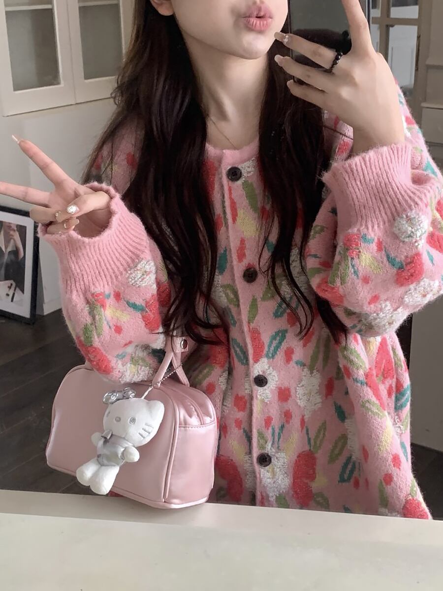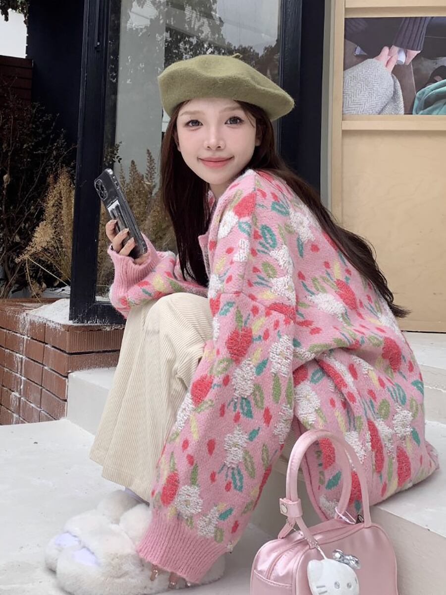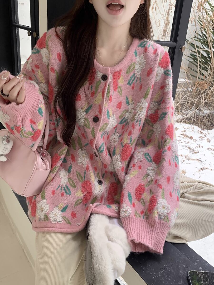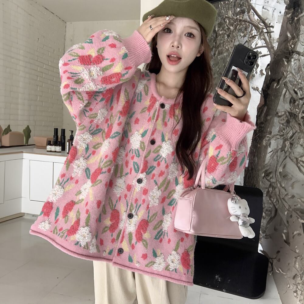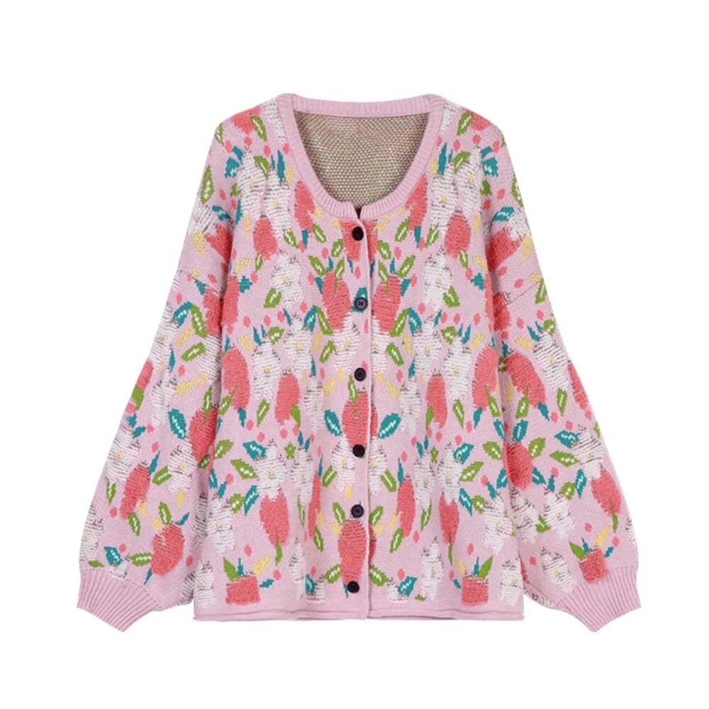 オーバーサイズ花柄ジャガードラウンドネックカーディガン ピンク 長袖カーディガン ニットトップス 大きめ ゆったり ジャガード 花柄 ボア加工 ボア カーディガン 長袖 ニット 秋冬 あったか 楽ちん かわいい 大人可愛い きれいめ カジュアル おしゃれ お洒落 レトロ 大人女子 こなれ感 ラブリー キュート ガーリー 個性的 モダン 主役級 存在感 抜け感 デート お出かけ 女子会 休日 着回し 普段使い 韓国ファッション
