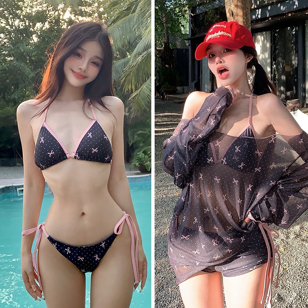 4点セット 水着 リボンドット柄対サイドビキニ上下+長袖ラッシュガード+ハイエストボトム 黒 ブラック ピンク リボンプリント 三角ビキニ タンキニ スイムウェア セパレート パッド付き ノンワイヤー ワイヤーなし 体系カバー ショートパンツ サイドドロスト かわいい 大人可愛い きれいめ お嬢様 華やか 大人 おしゃれ お洒落 主役級 存在感 女っぽ ラブリー キュート ガーリー スタイリッシュ モダン 体系カバー 美脚 脚長 韓国コーデ 韓国ファッション