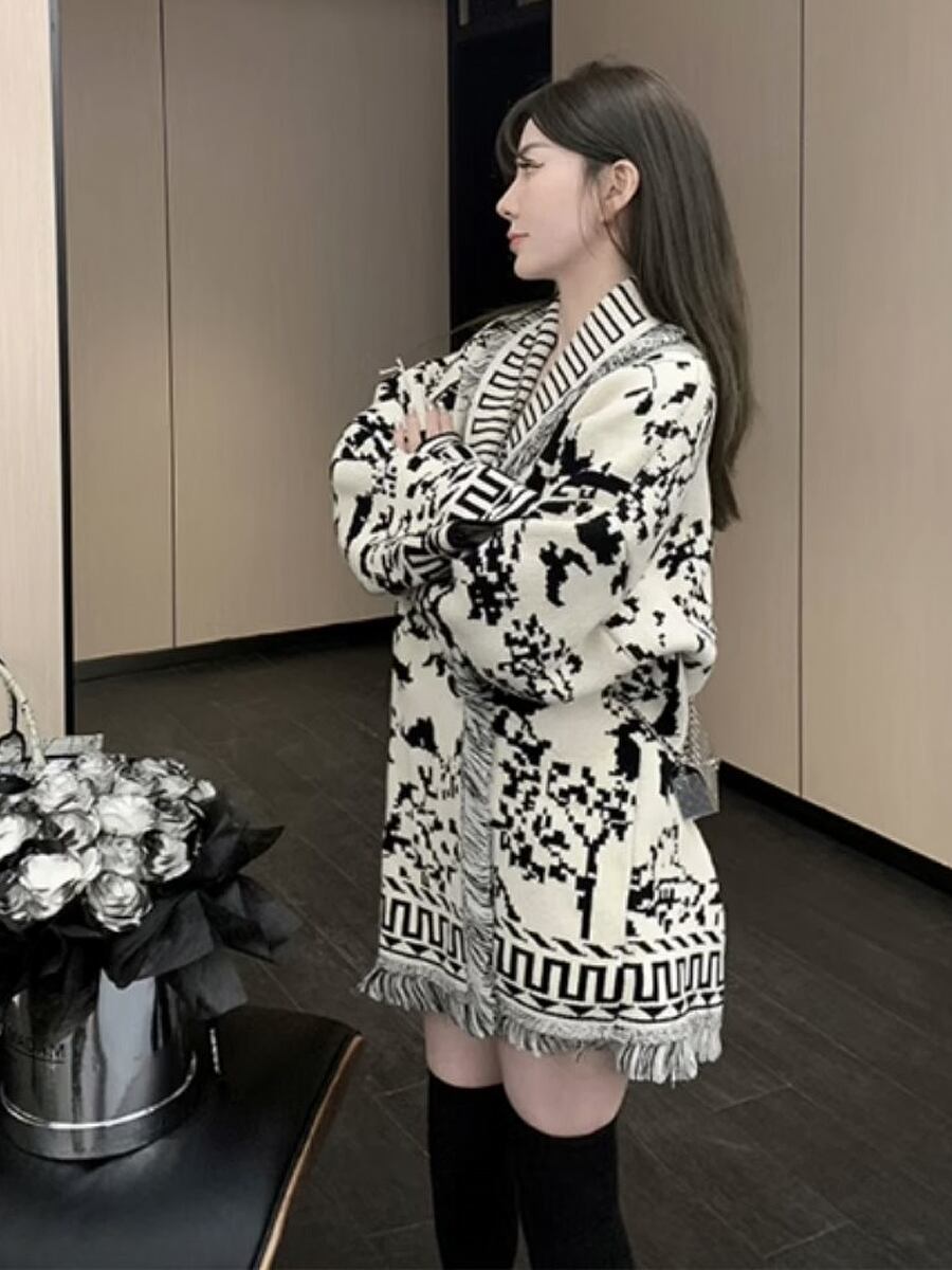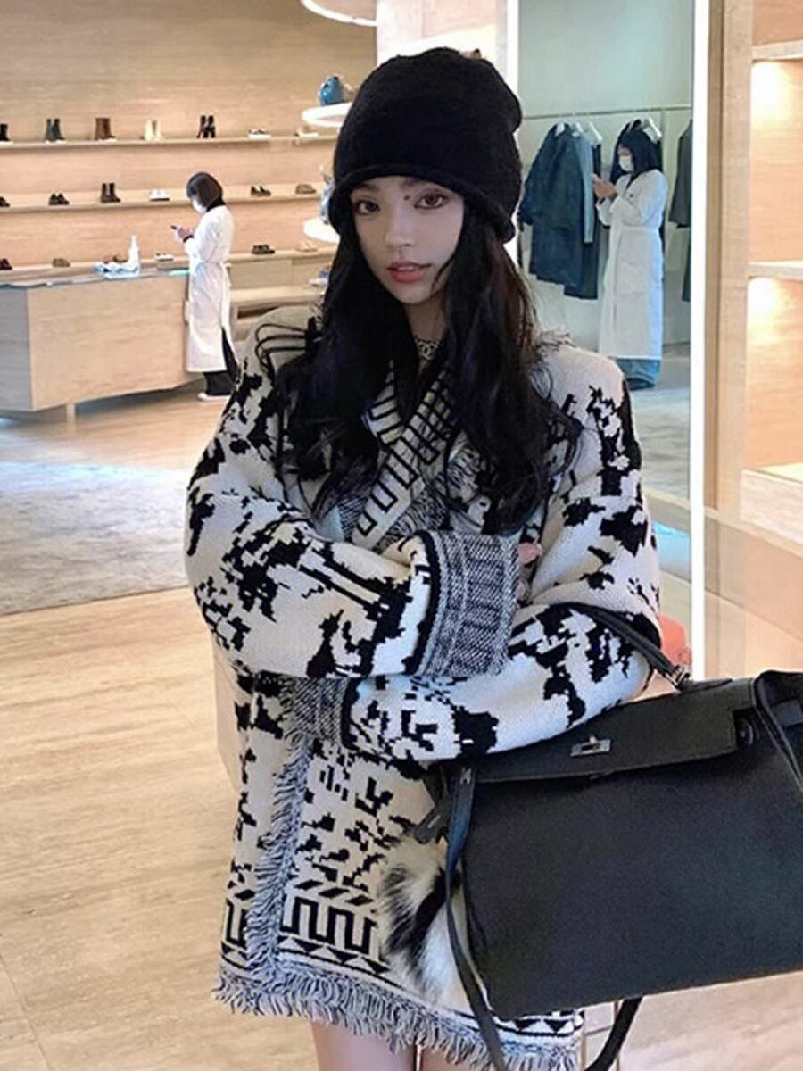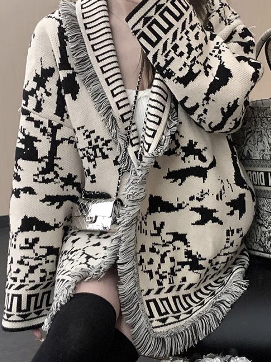 エスニックデザインフリンジニットカーディガン ニットカーディガン オーバーサイズ 大きめ ボタンレス ざっくり フリンジ カーディガン ニット モノクロ エスニック柄 Vネック ヘチマ襟 袖あり 長袖 かわいい 大人可愛い きれいめ シンプル カジュアル 大人 上品 おしゃれ お洒落 レトロ 大人女子 こなれ感 ラフ キュート 秋 冬 レディース 通勤 通学 デート お出かけ 着回し 普段使い 重ね着 楽ちん 暖かい 韓国コーデ 韓国ファッション 白黒