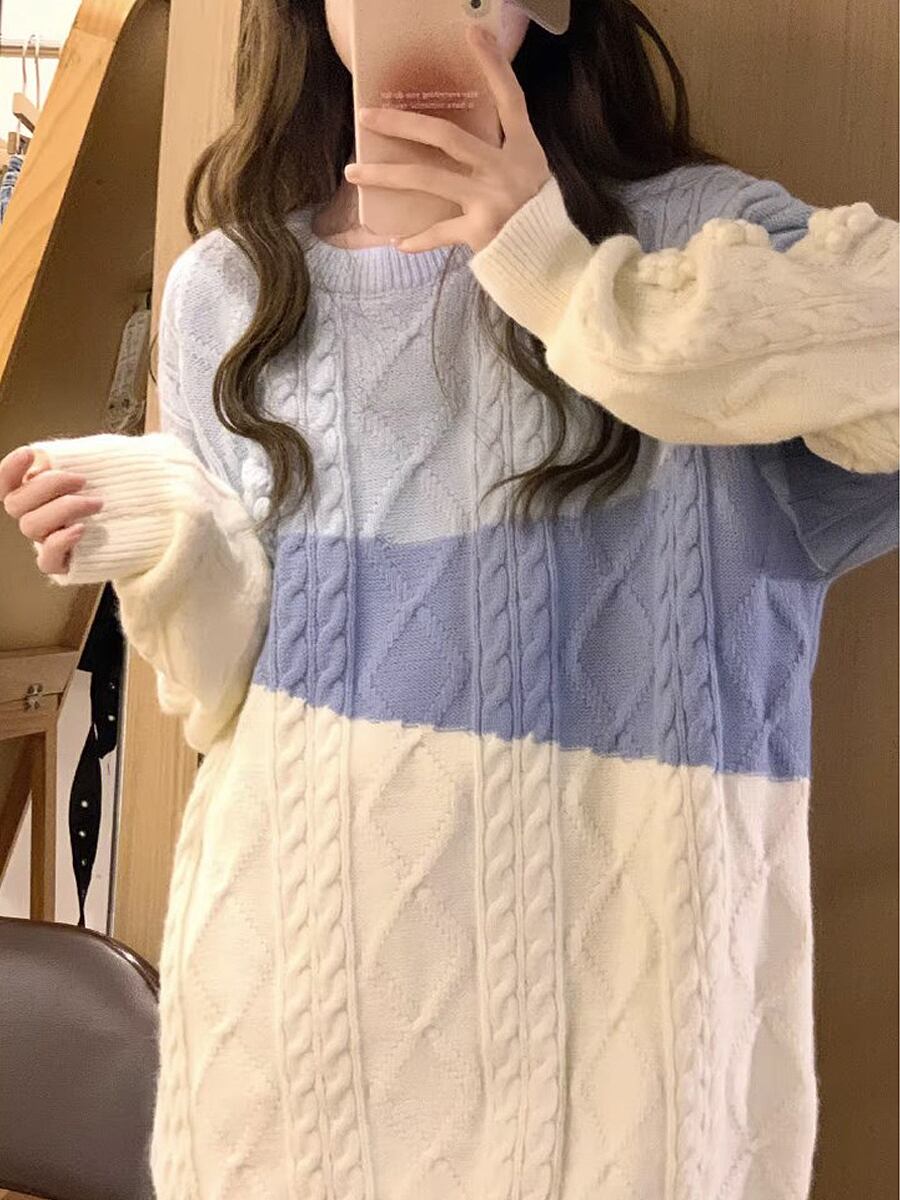 ブルー系の縄編み(ケーブル編み)ニットセーターです。