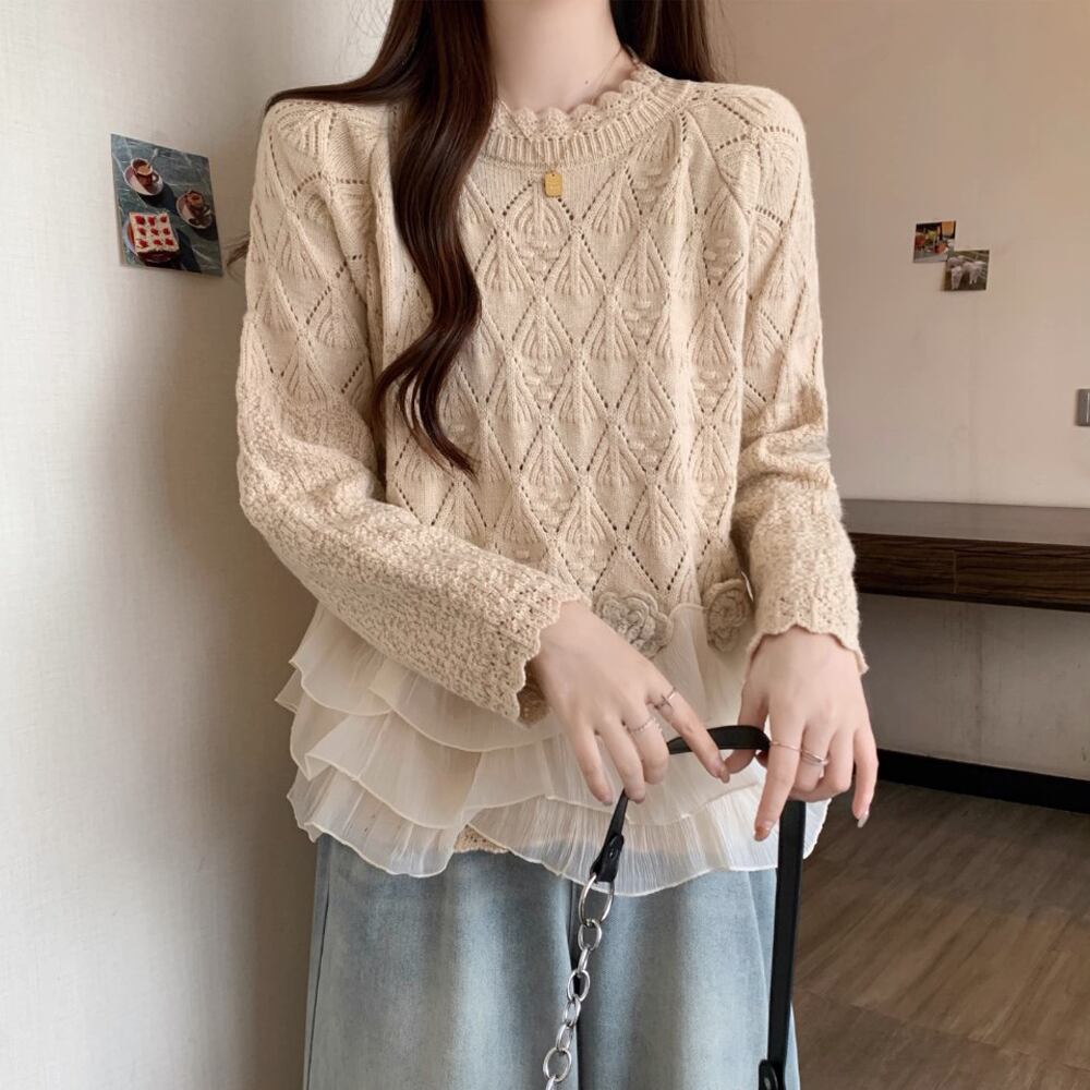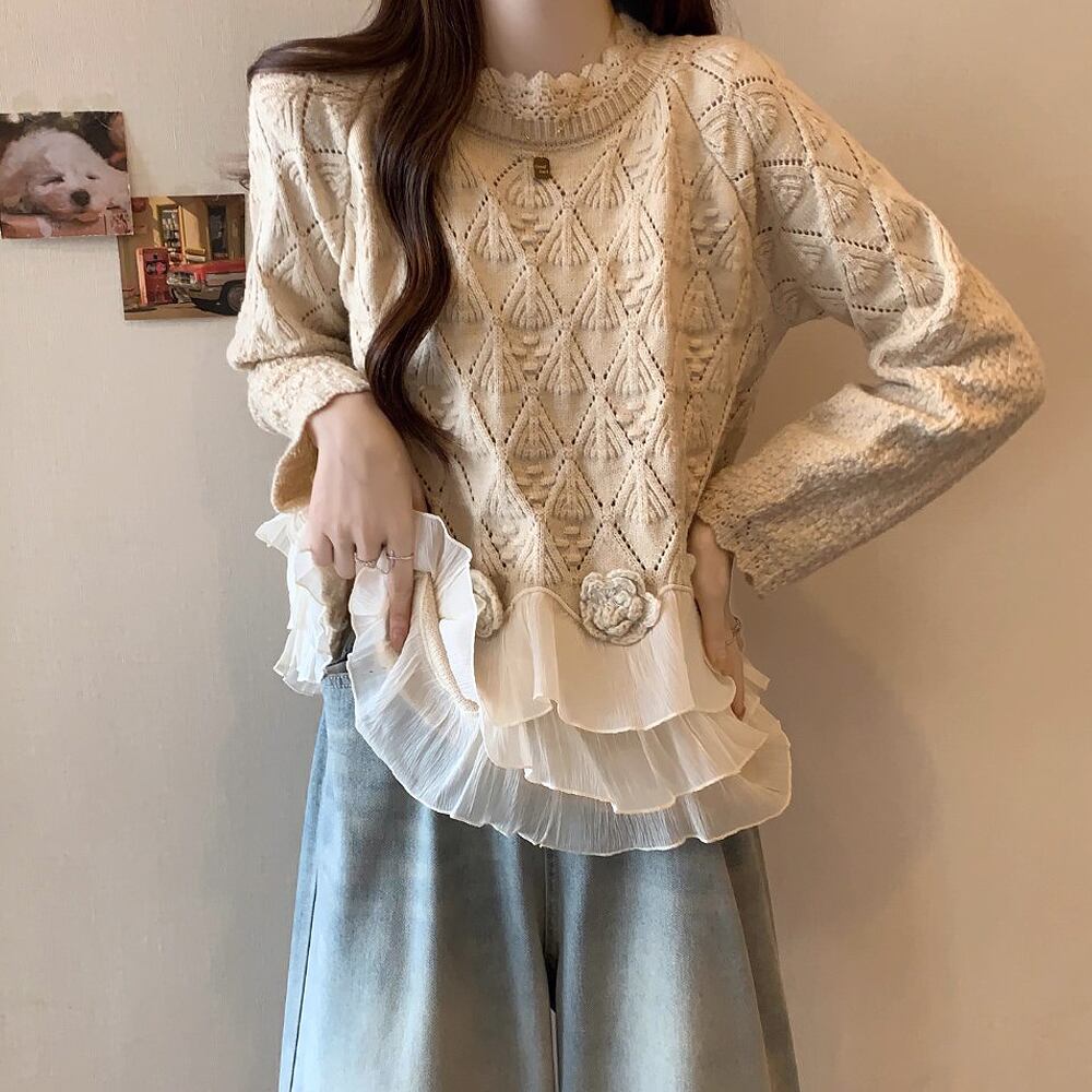 かぎ針の花モチーフと裾のフリルがポイントのニットセーターです。