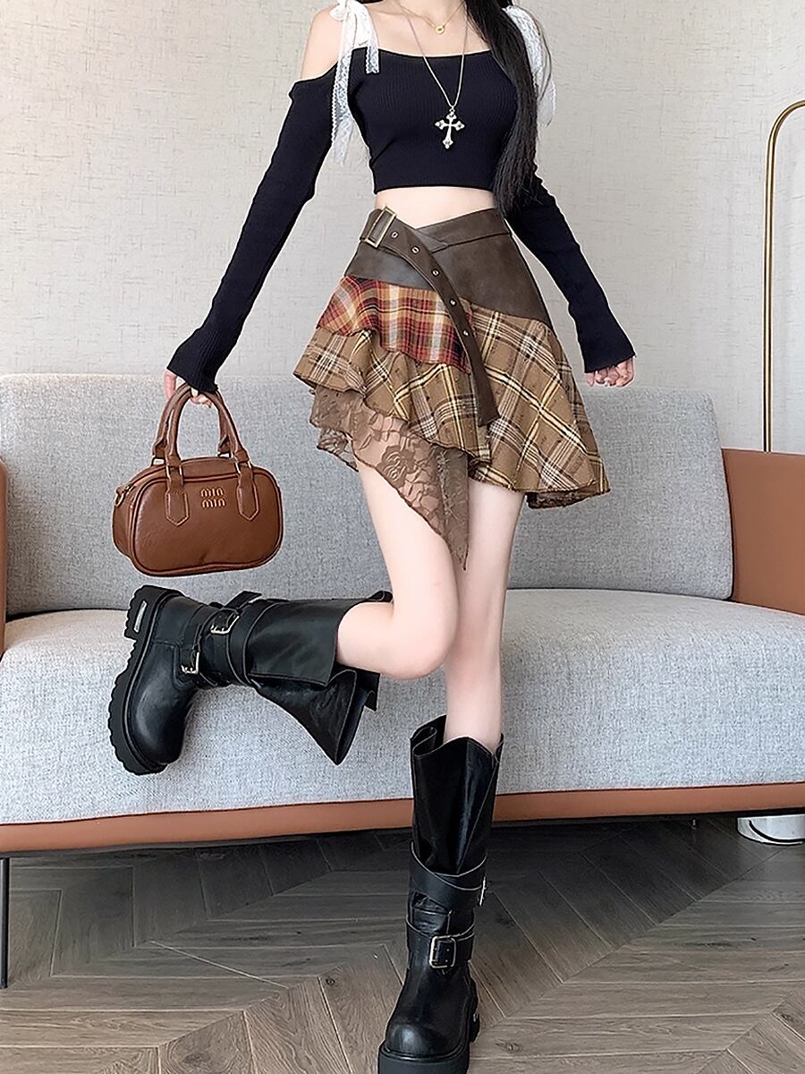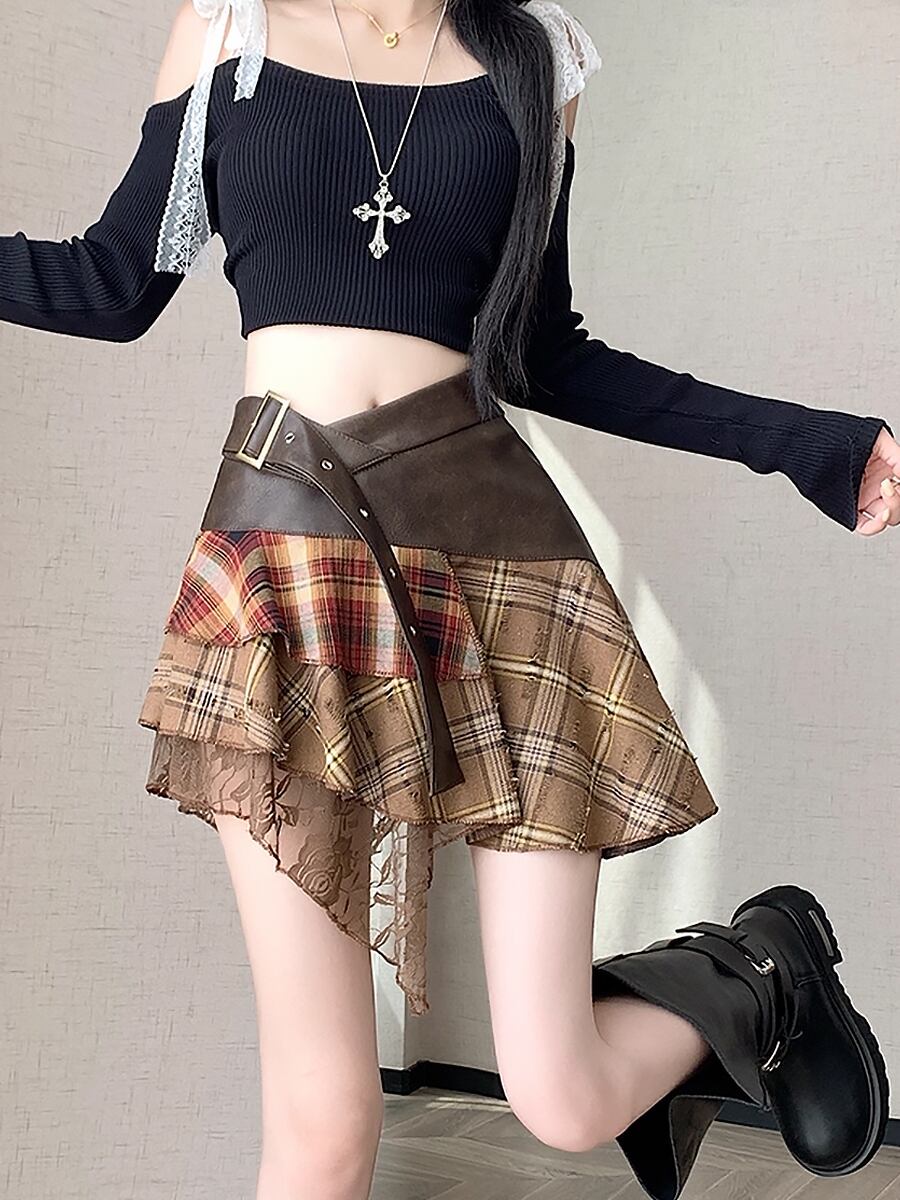PUレザーとタータンチェックにレースが重ねられた秋冬にぴったりのティアードスカートです。