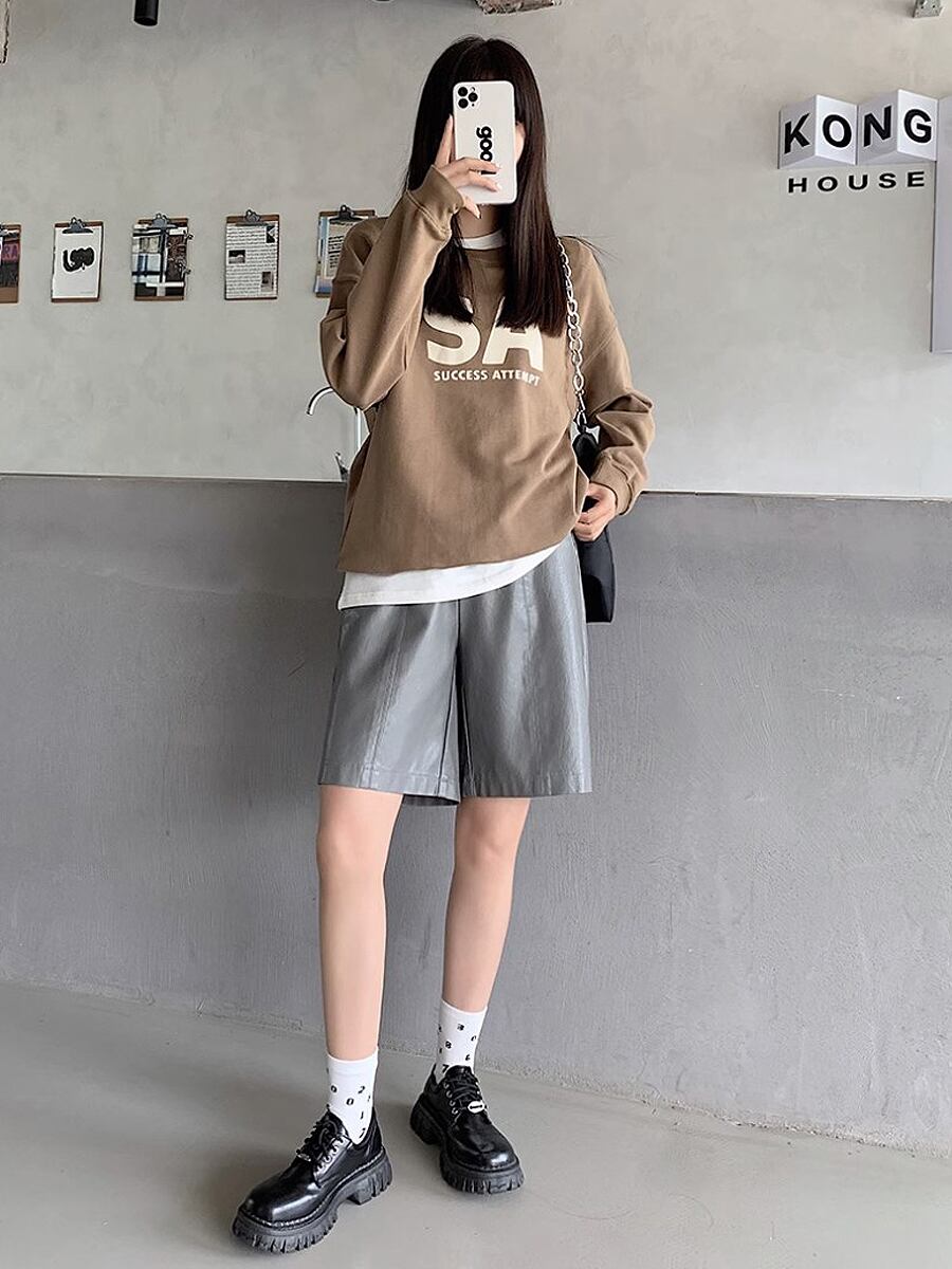 全2色 PUレザーセミショートパンツ ショーパン ショートパンツ ウエスト後ろゴム 膝上 フェイクレザー PU かわいい 大人可愛い きれいめ シンプル おしゃれ お洒落 かっこいい レトロ こなれ感 ラブリー キュート ガーリー 個性的 モード系 モダン 主役級 存在感 抜け感 無地 レディース お出かけ 着回し 普段使い 韓国コーデ 韓国ファッション 黒 ブラック 茶色 ブラウン