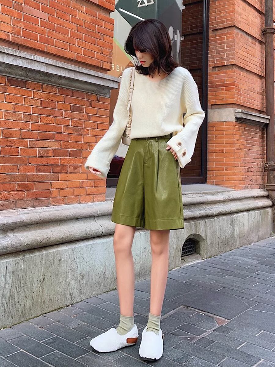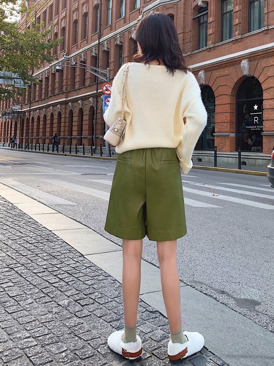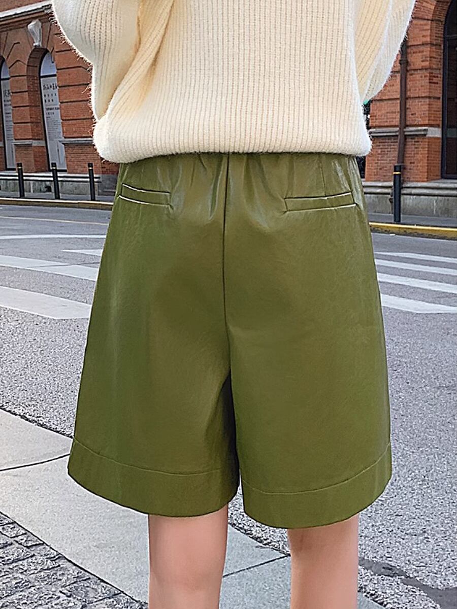 全3色 膝上PUレザーソフトセミショートパンツ ショーパン ショートパンツ ウエスト後ろゴム 膝上 フェイクレザー PU かわいい 大人可愛い きれいめ シンプル おしゃれ お洒落 かっこいい レトロ こなれ感 ラブリー キュート ガーリー 個性的 モード系 モダン 主役級 存在感 抜け感 無地 レディース お出かけ 着回し 普段使い 韓国コーデ 韓国ファッション 黒 ブラック ベージュ 緑 グリーン