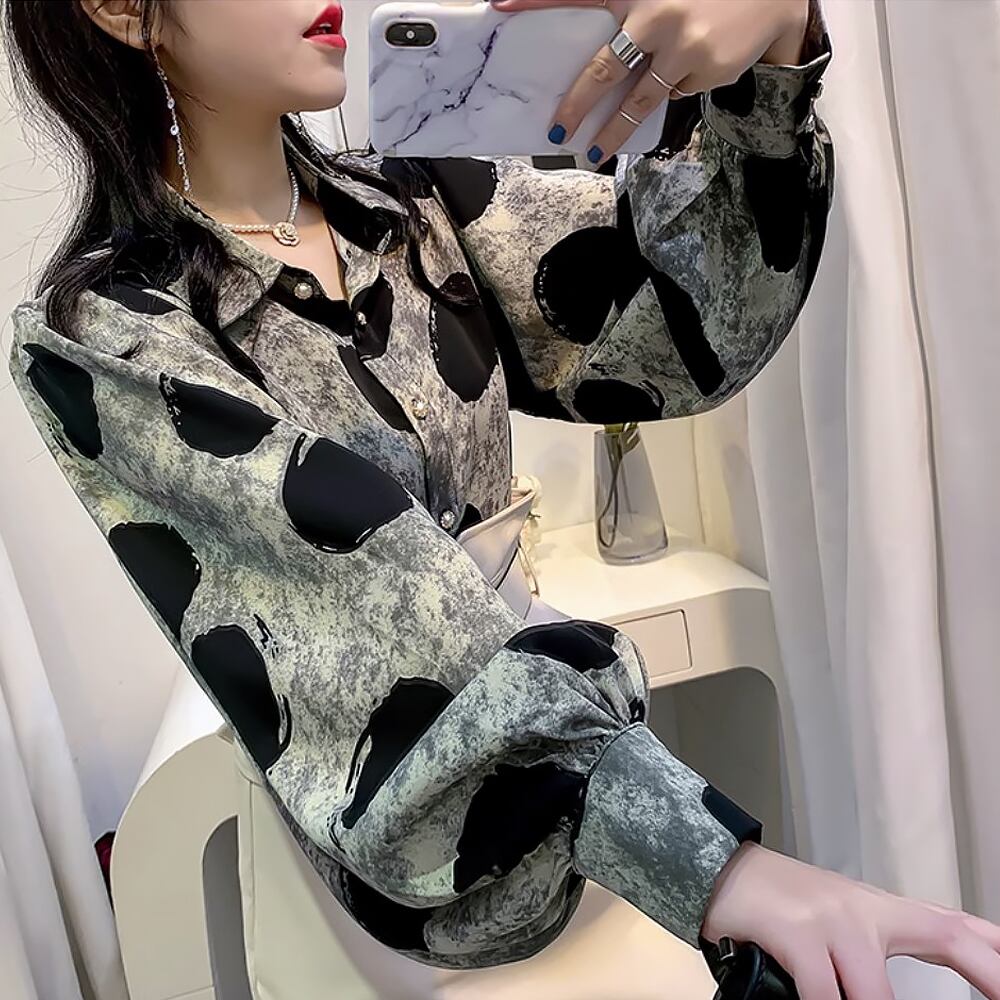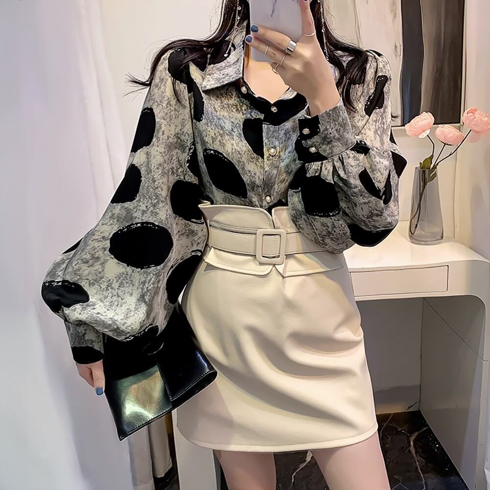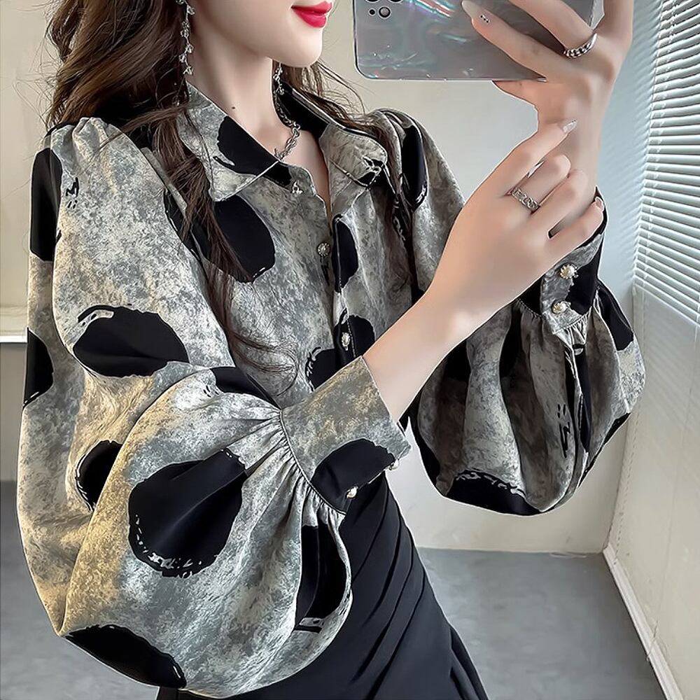 ルーズランタンスリーブドットプリントシャツブラウス トップス ゆったり ボリュームスリーブ 長袖 シャツ ブラウス 灰色 グレー系 レトロプリント 水玉 ドット 着回し 襟付き 前開き ボタン きれいめ デート お出かけ かわいい 大人可愛い 通勤 きれいめ カジュアル おしゃれ お洒落 かっこいい 大人可愛い 大人女子 ラフ ラブリー キュート 個性的 レディース お出かけ インスタ映え 韓国コーデ 韓国ファッション 黒