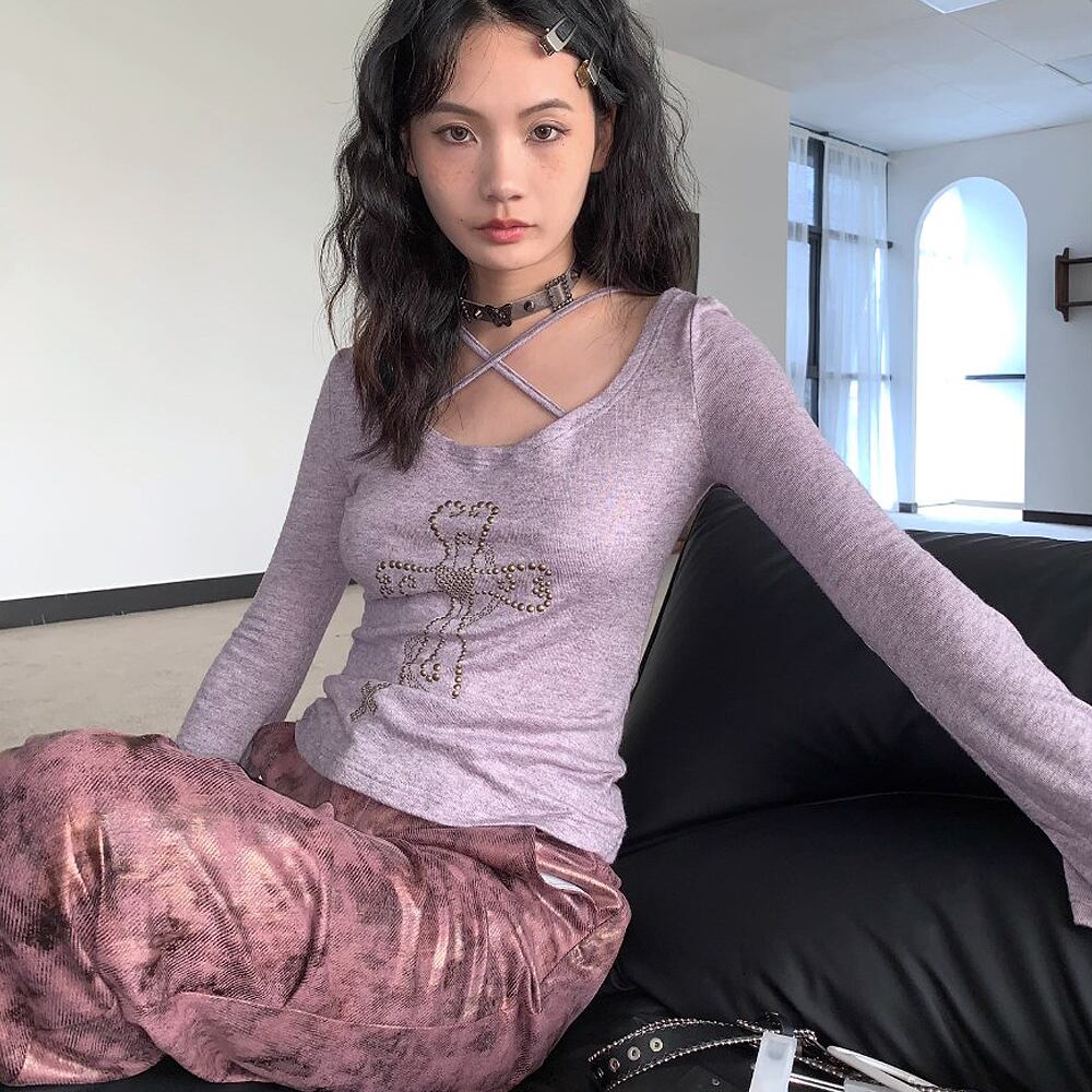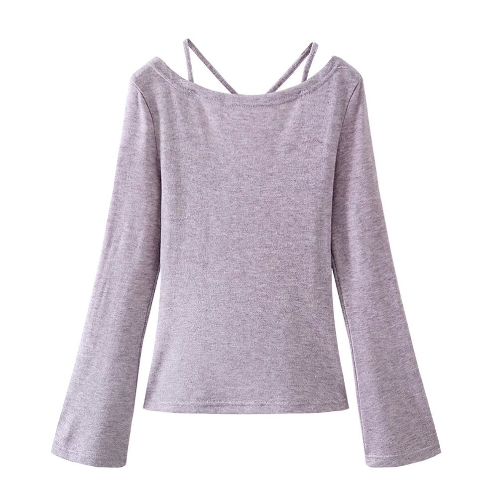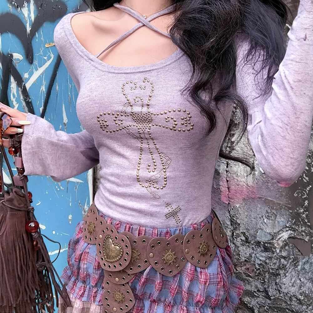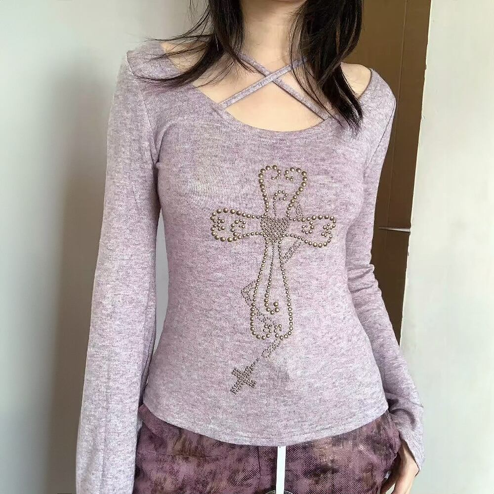 フロントクロス長袖Tシャツ Tシャツ 長袖 カットアウト チラ見せ フロントカットアウト クロス 十字架 春 秋 冬 ビジュー風デザイン ビジュー風 鎖骨チラ見せ 鎖骨クロス 交差 紫 パープル くすみカラー くすみパープル にじみカラー カジュアル おしゃれ かっこいい レトロ こなれ感 春 夏 レディース 個性的 デート お出かけ 普段使い 重ね着 韓国コーデ 韓国ファッション