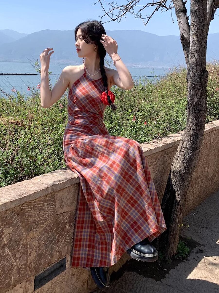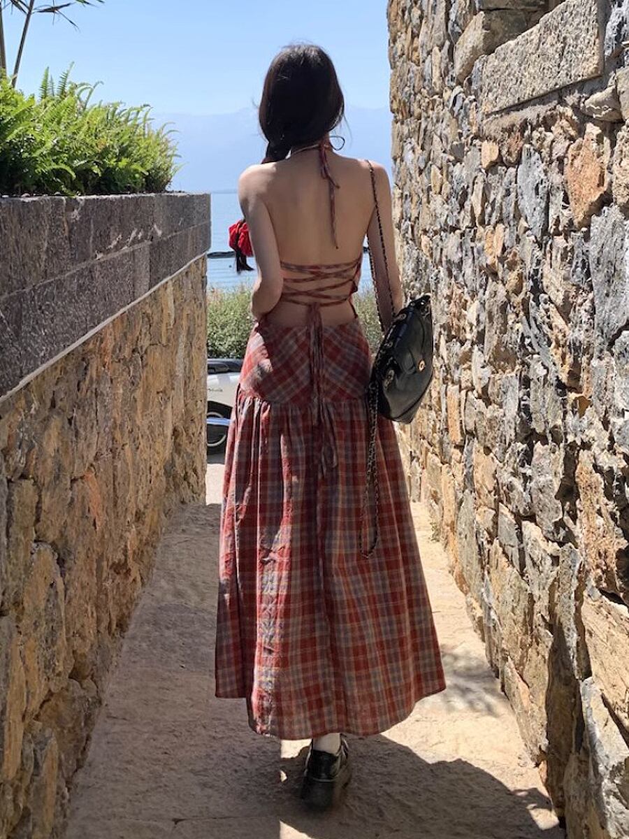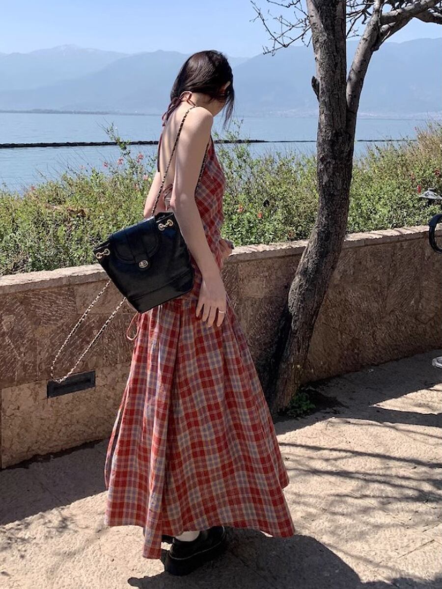 サマーワンピース 夏ワンピ 夏ワンピース チェック チェック柄 ベアバック 背中開き バッククロスロングワンピースドレス Aライン ワンピース バックリボン バッククロス フレアスカート キャミソールワンピース バックシャン バックコンシャス マキシ丈 ロング丈 きれいめ かわいい 大人可愛い きれいめ シンプル 上品 おしゃれ お洒落 かっこいい レトロ 大人女子 こなれ感 ラブリー ガーリー 個性的 モード系 エレガント モダン 韓国コーデ 韓国ファション 赤 レッド