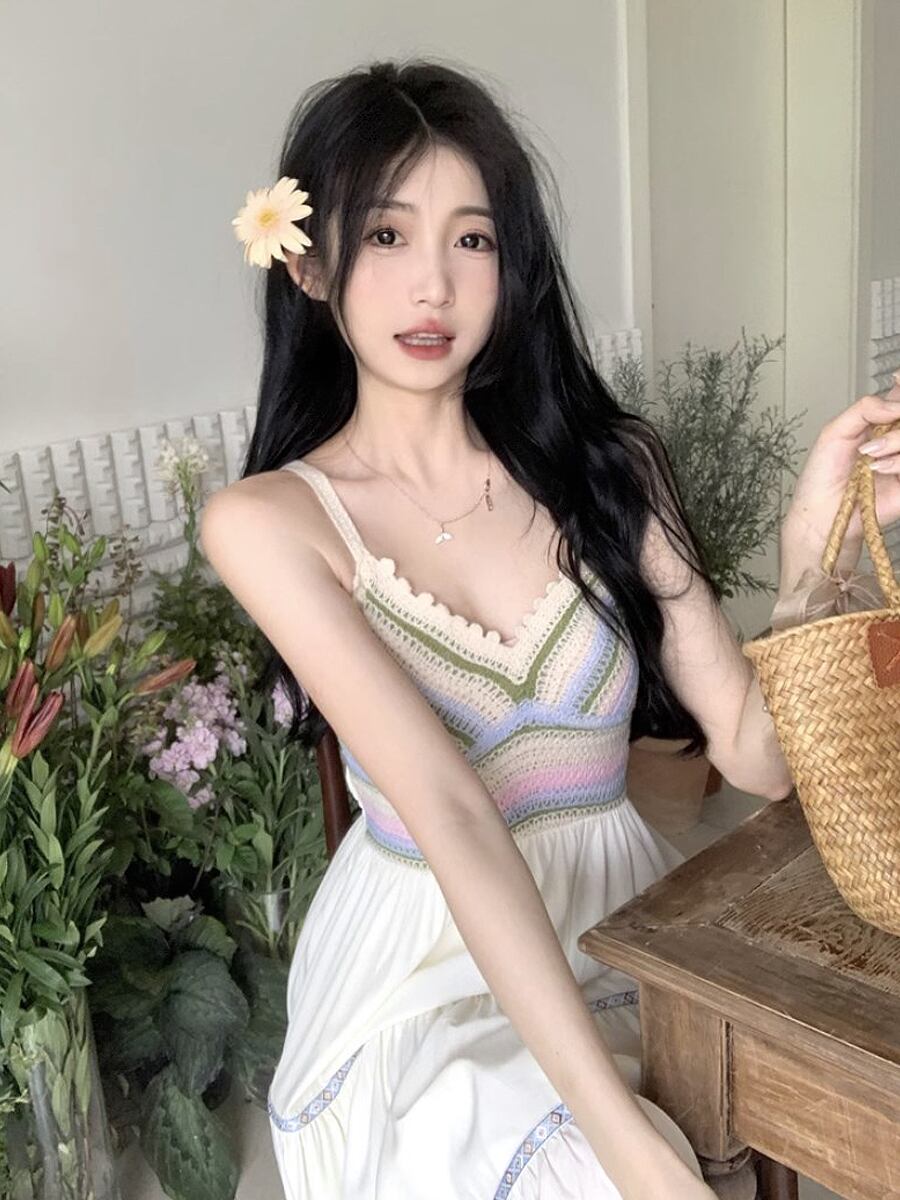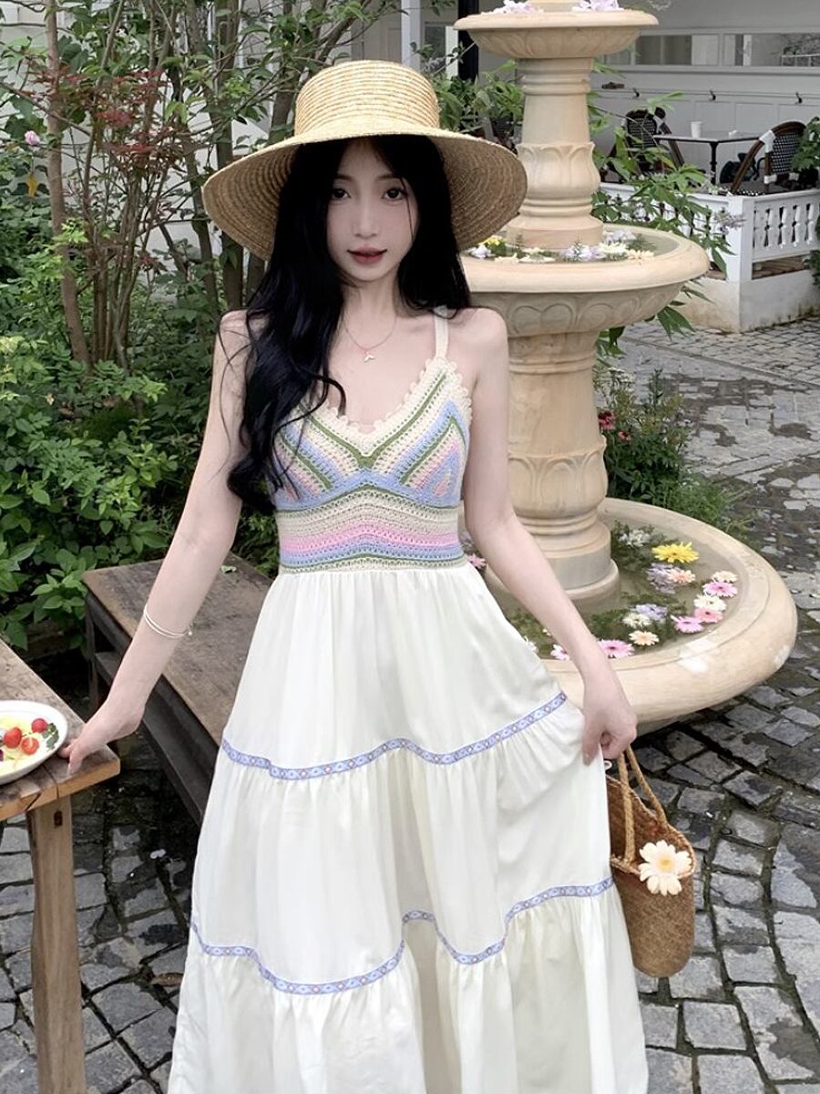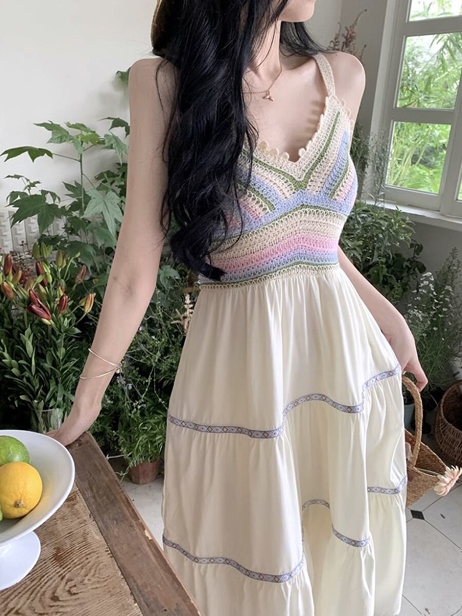 異素材クロシェ網キャミソールワンピース キャミワンピ フレアワンピース ボヘミアン フォークロア ワンピース ミモレ ロング レトロ かぎ針編み クロシェ網 サマーニット 段々フリル ティアードスカート ティアード 襟なし フレア Aライン ウエストマーク 動き楽ちん ふんわり 薄手 かわいい 大人可愛い きれいめ シンプル 上品 おしゃれ お洒落 大人女子 ラブリー キュート エレガント 韓国コーデ 韓国ファッション ホワイト 白 グリーン系