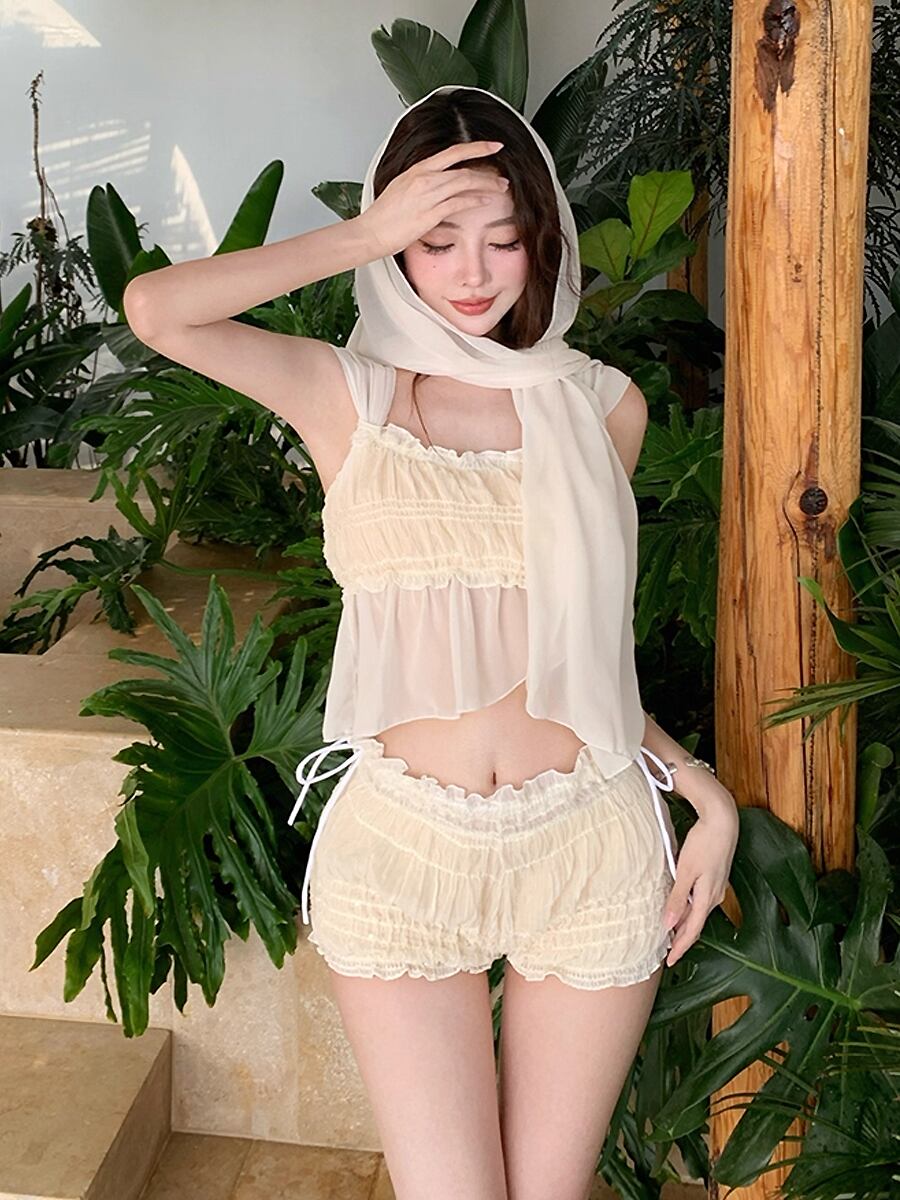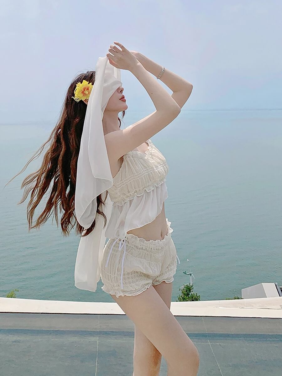 水着 ビキニ アンダーバストフレア付きハイウエストビキニ かぼちゃパンツ くしゅっと感 くしゅくしゅ生地 ハイウエスト 白 ホワイト オフホワイト アイボリー シャーリング レディース スイムウェア ウエストリボン 腰高 パッド付き ノンワイヤー ワイヤーなし 露出少なめ 体系カバー 大人可愛い ガーリー 可愛い おしゃれ お洒落 個性的 レディース ホテル 温泉 海 ビーチ プール リゾート 韓国コーデ