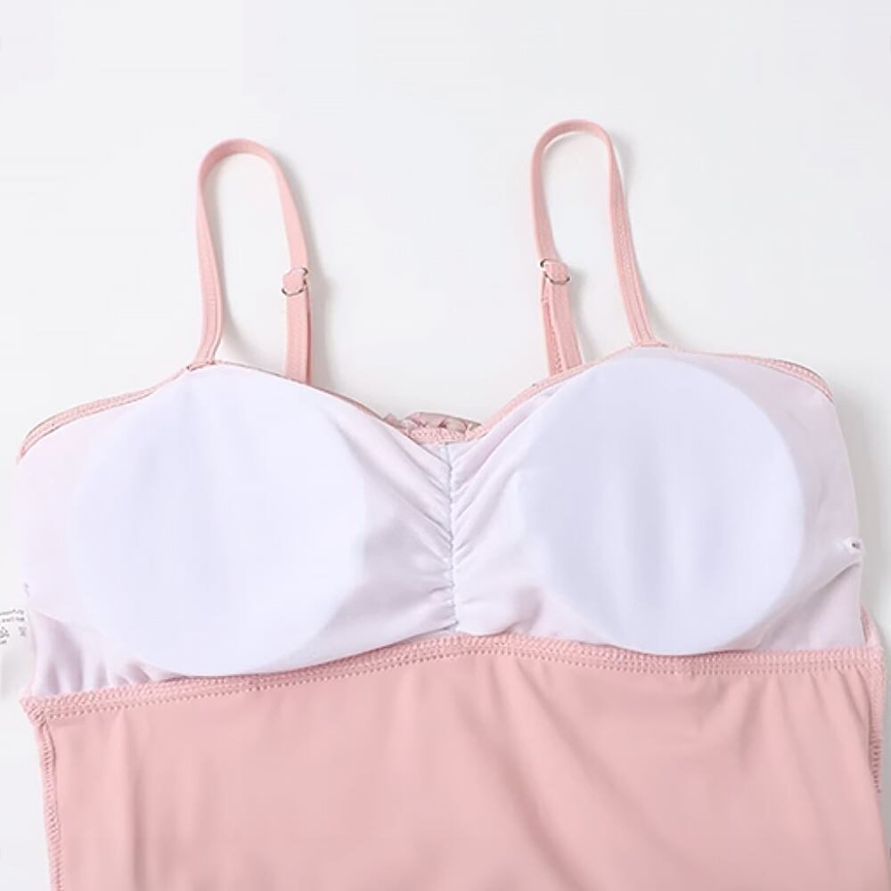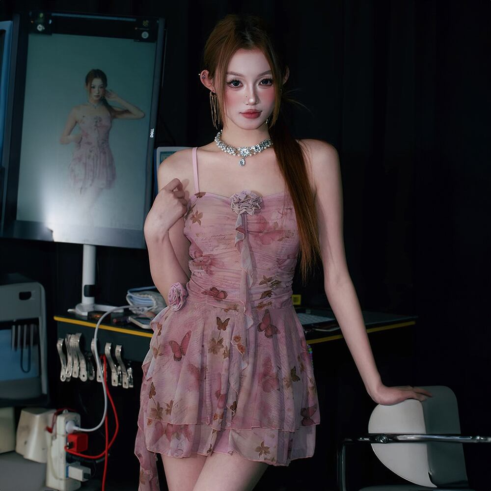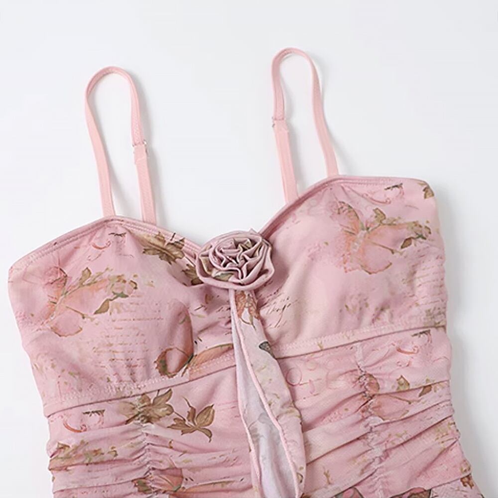 フロントのお花モチーフとラッフルリボンが可愛いガーリーな花と蝶々柄の水着ワンピースです。