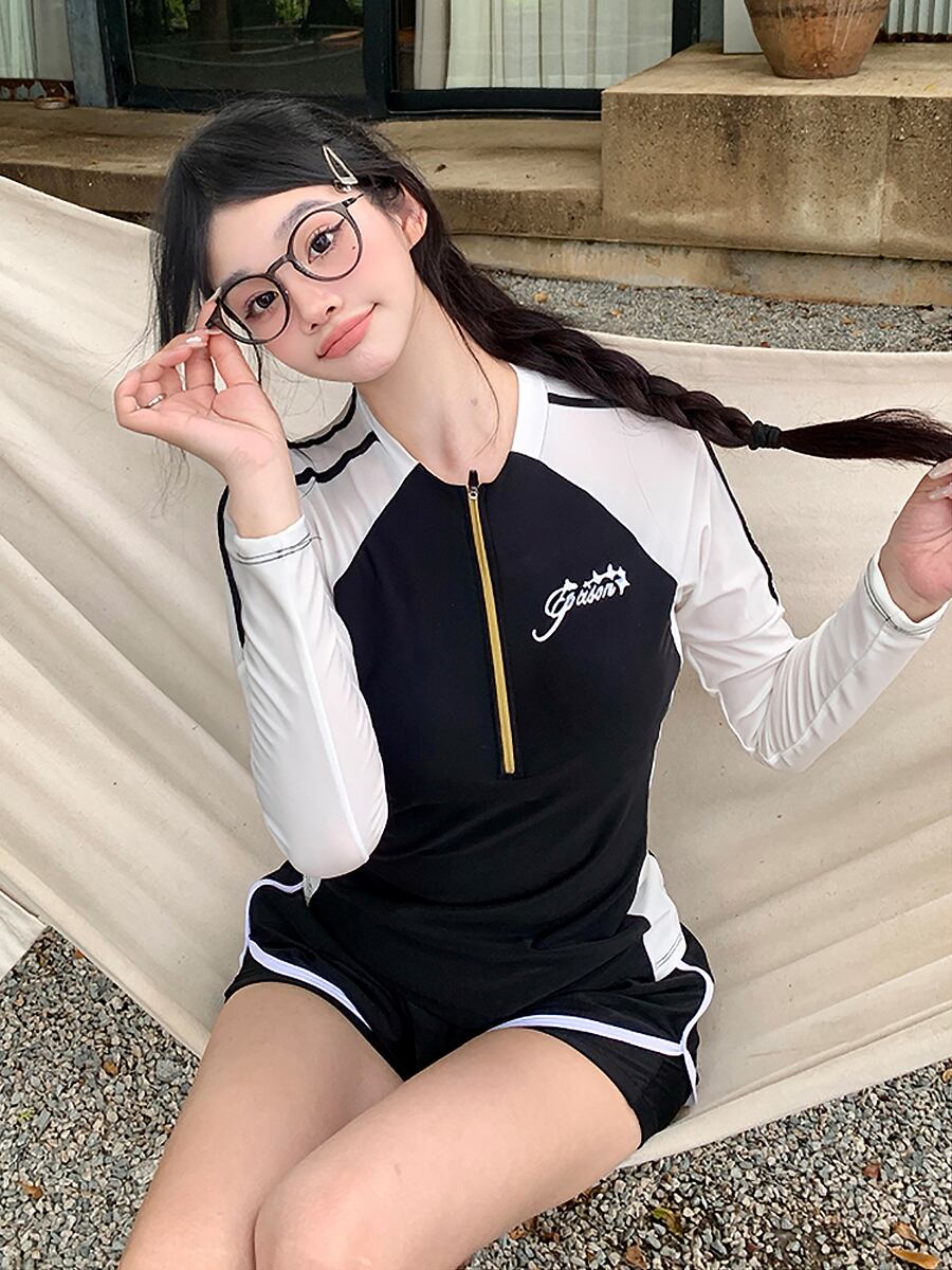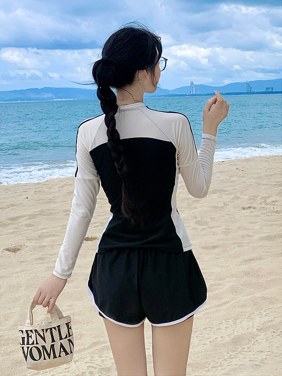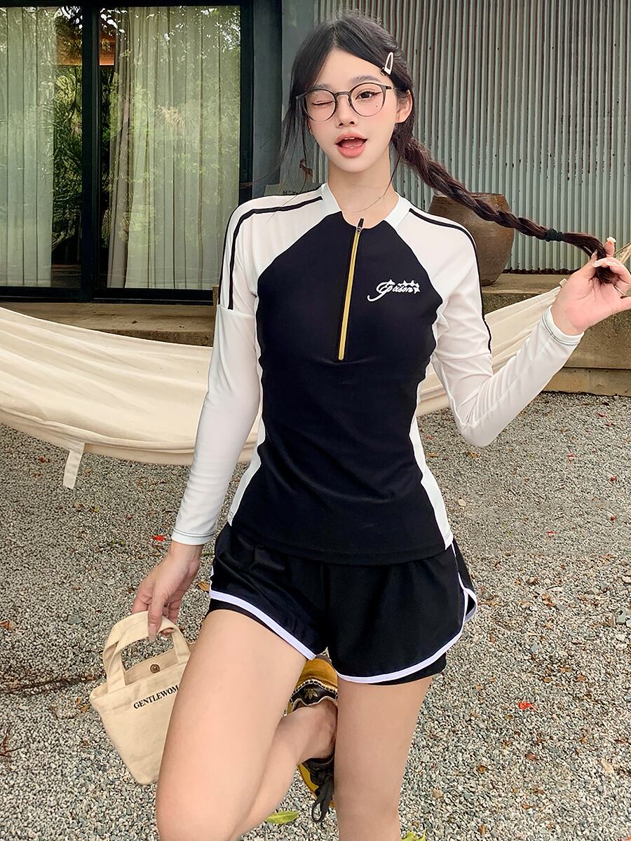 水着 長袖ビキニ スポーティセパレート水着 白黒 ドッキングショートパンツ ツーピース ビキニ セパレート 長袖 ラッシュガード水着 ハーフジップアップ ショートパンツ フレア フィットネス フェイクショートパンツ ホワイト ブラック 白 黒 ラッシュガード 二の腕カバー 体型カバー スポーティ 水遊び きれいめ フェミニン かわいい パッド付き ワイヤーなし 伸縮性 セット 上下セット かわいい 大人可愛い きれいめ セクシー おしゃれ スタイリッシュ スイムウェア