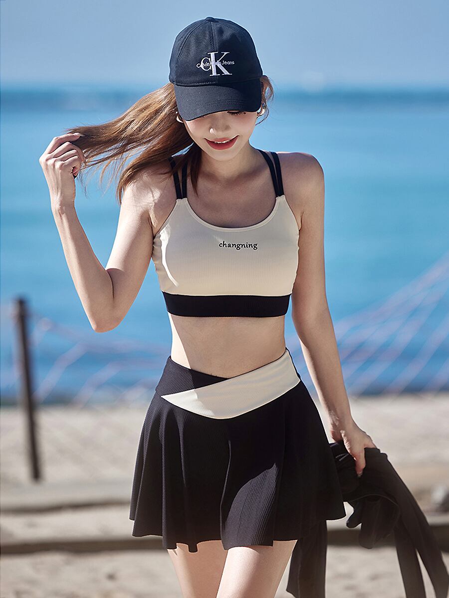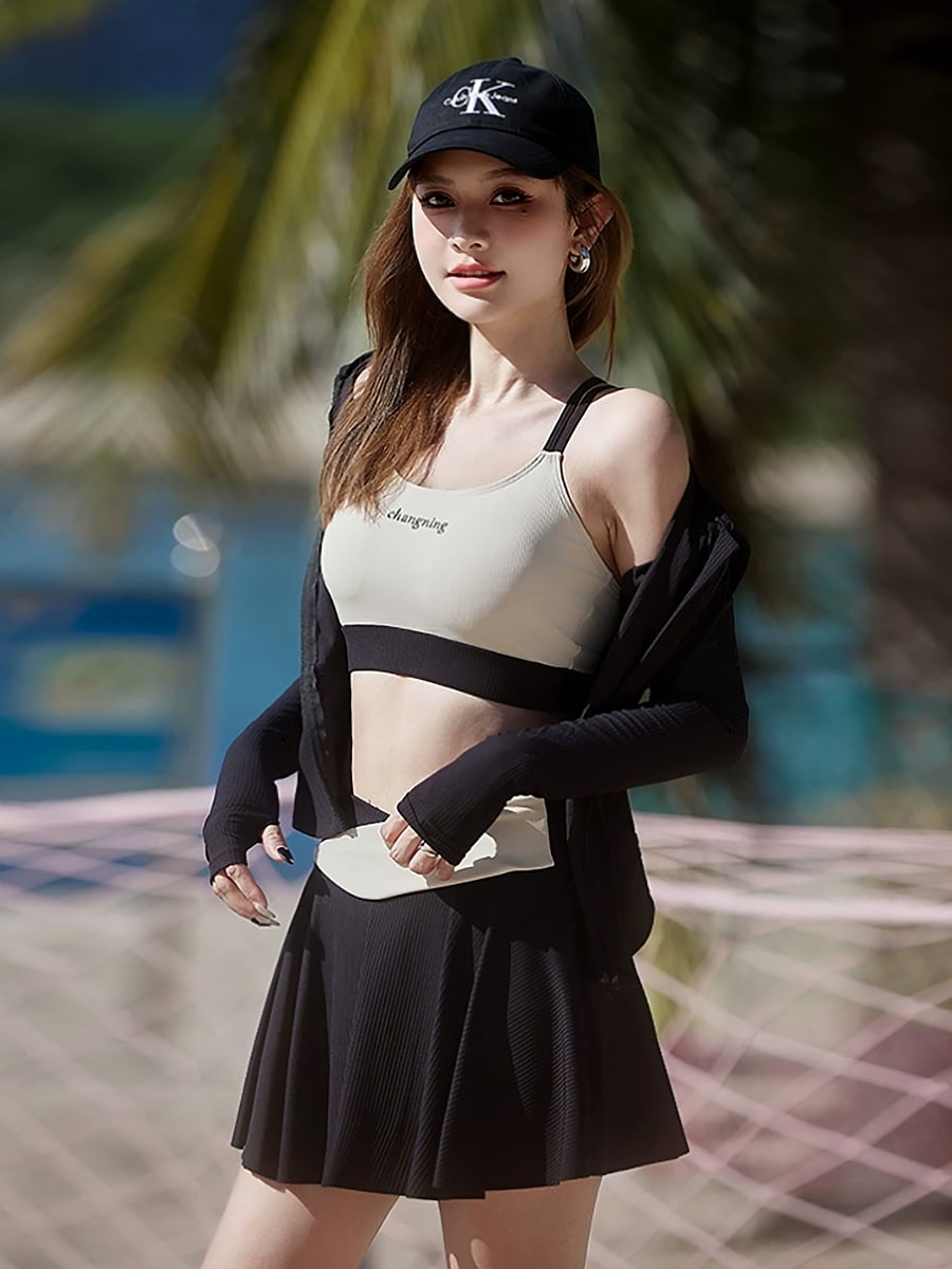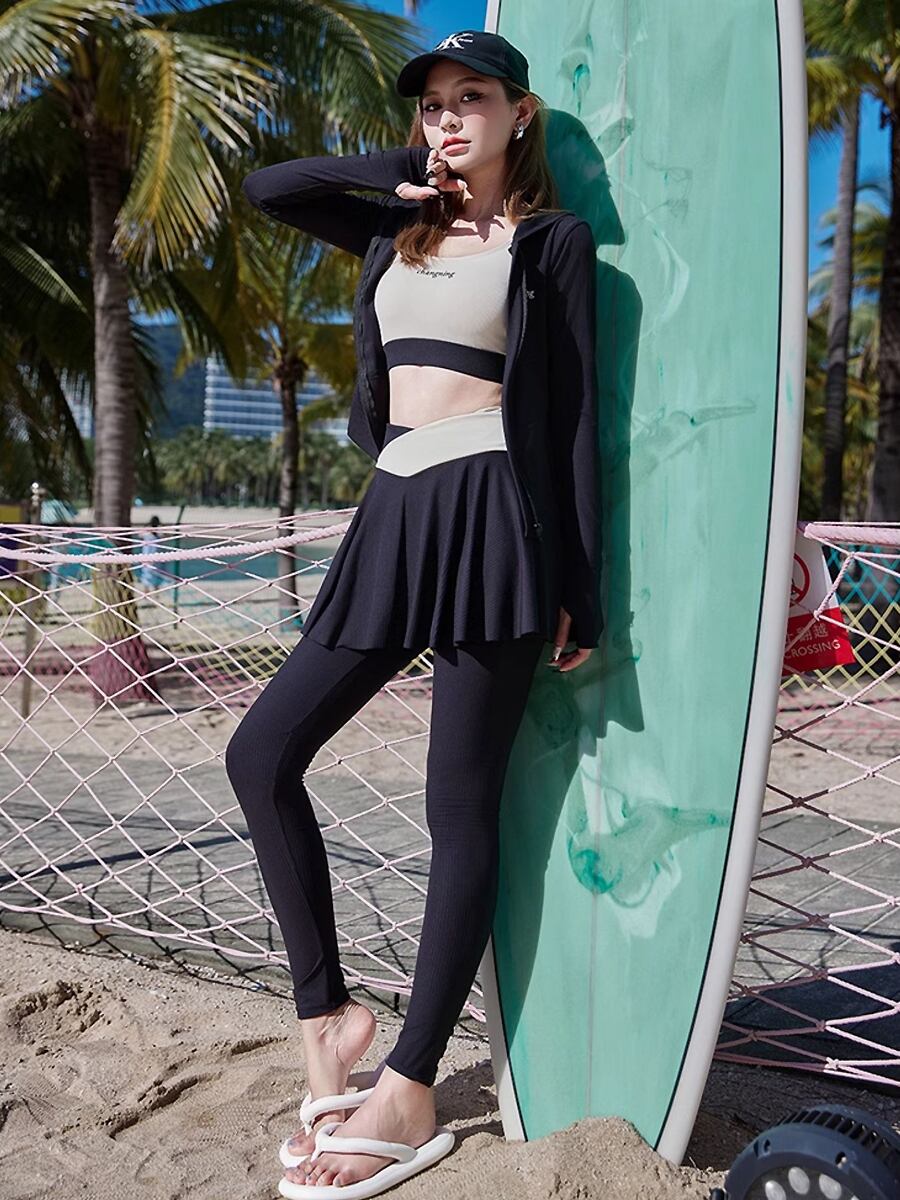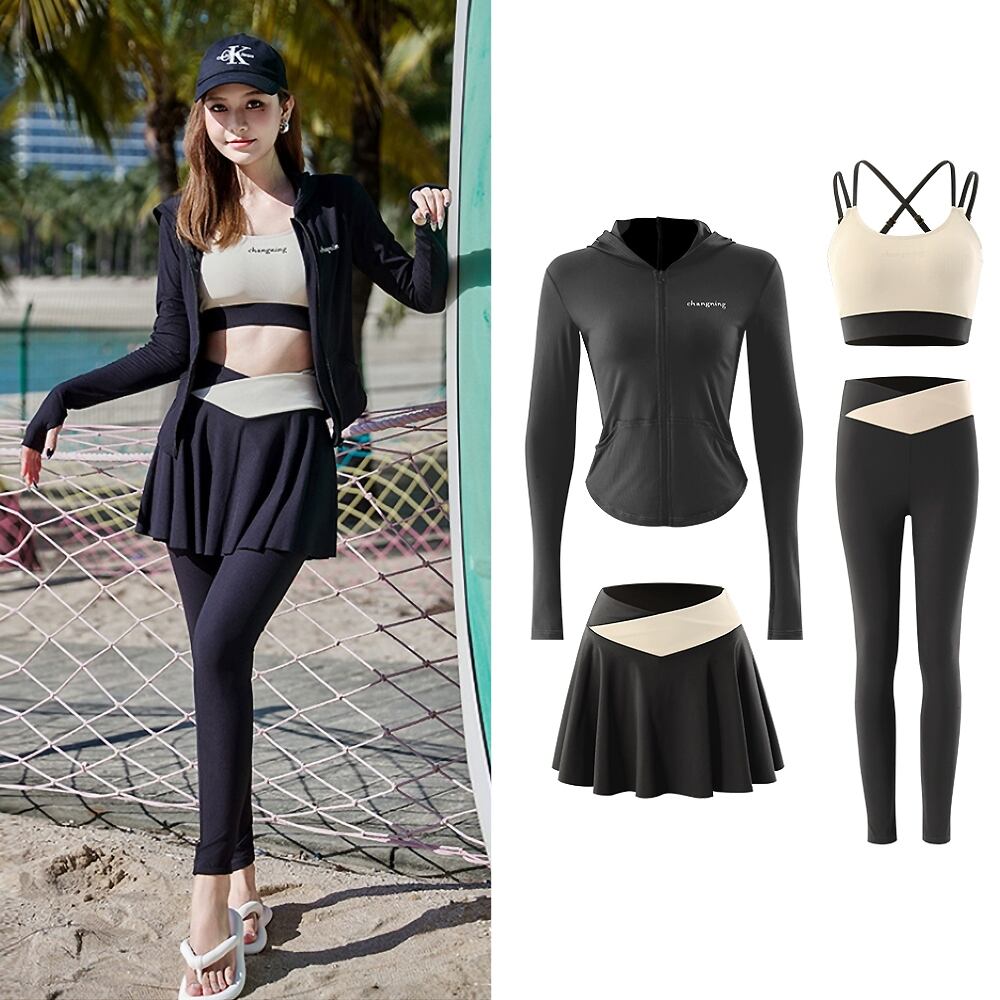 4点セット水着 長袖フード付きトップス+スカート付きパンツ+ロングパンツ スポーティセパレート水着 サムホール 親指穴開き袖 ビキニ セパレート ジップアップパーカー 猛暑対策 酷暑対策 ラッシュガード水着 ダイビング ホワイト 黒 ブラック 二の腕カバー 体型カバー スポーティ 水遊び きれいめ フェミニン かわいい パッド付き ワイヤーなし 伸縮性 セット かわいい 大人可愛い きれいめ セクシー おしゃれ スタイリッシュ 美脚 脚長 韓国コーデ 韓国ファション
