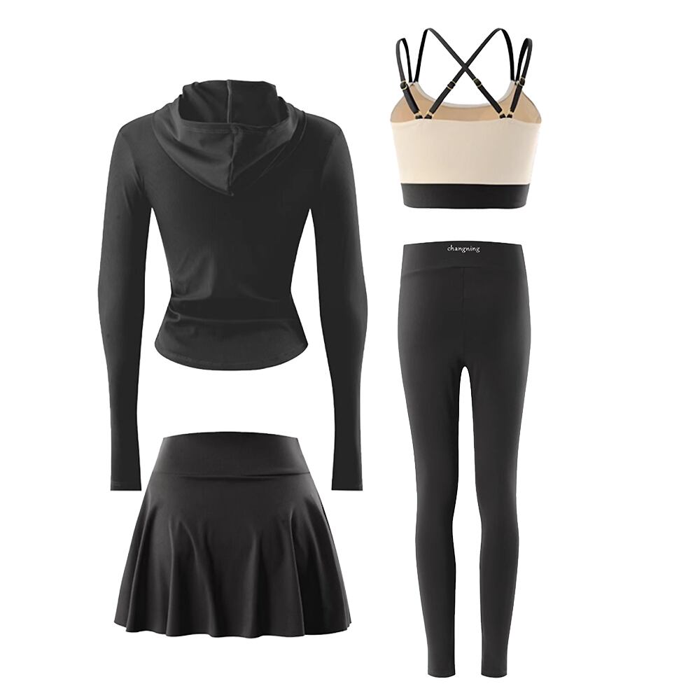 サムホール付きのジップアップ長袖パーカーとビキニブラトップス、フレスカート付きパンツとロングパンツの4点セットです。。