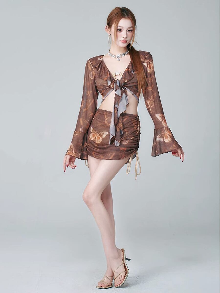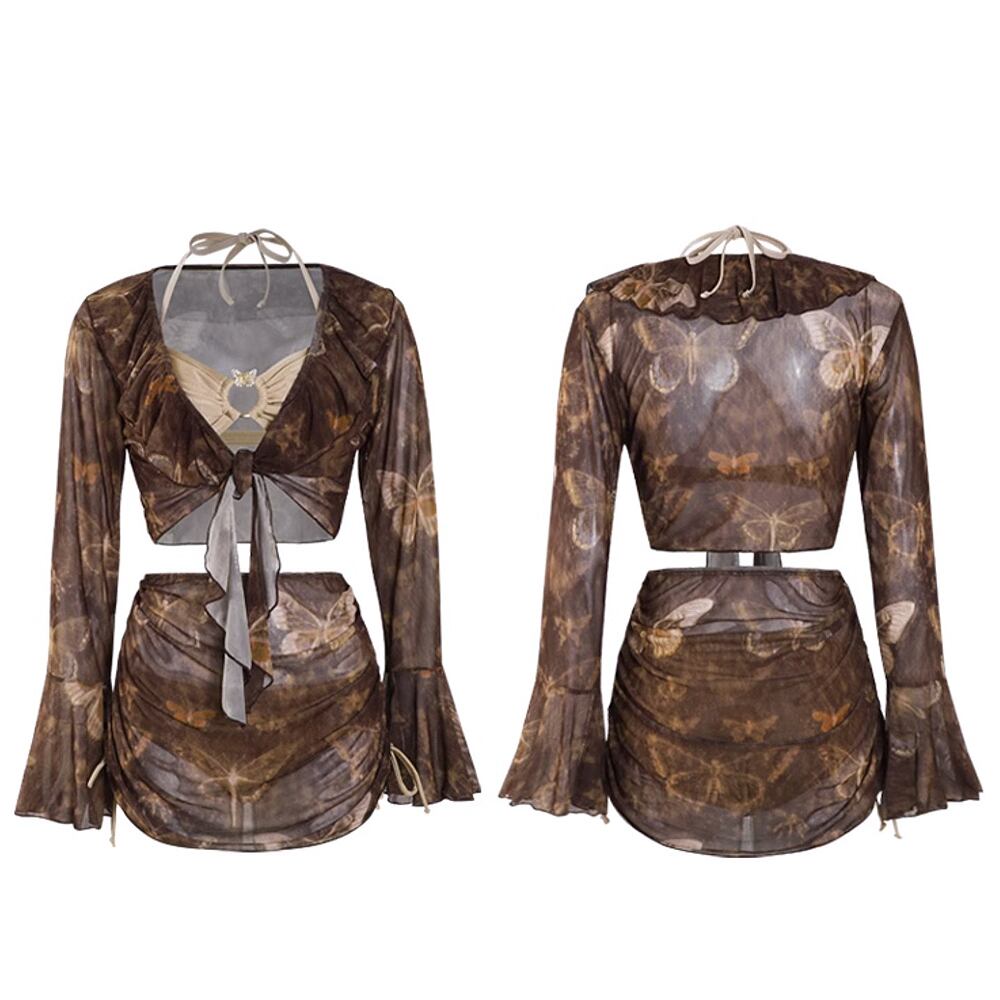 4点セット 水着 ホルターネックキーホールビキニ水着+ラッシュガードボレロー+ドロストミニスカート ビキニ 蝶々柄 蝶柄 バタフライプリント バタフライ 蝶々 ちょう パッド付き かわいい 大人可愛い シンプル 水遊び おしゃれ ラブリー キュート 個性的 かっこいい レディース 女性用 ママ ビーチ プール リゾート 旅行 体系カバー 美脚 脚長 スタイルアップ 美スタイル モテ インスタ映え 韓国コーデ 韓国ファッション ブラウン 茶色 ライトブラウン 薄茶 ダークブラウン