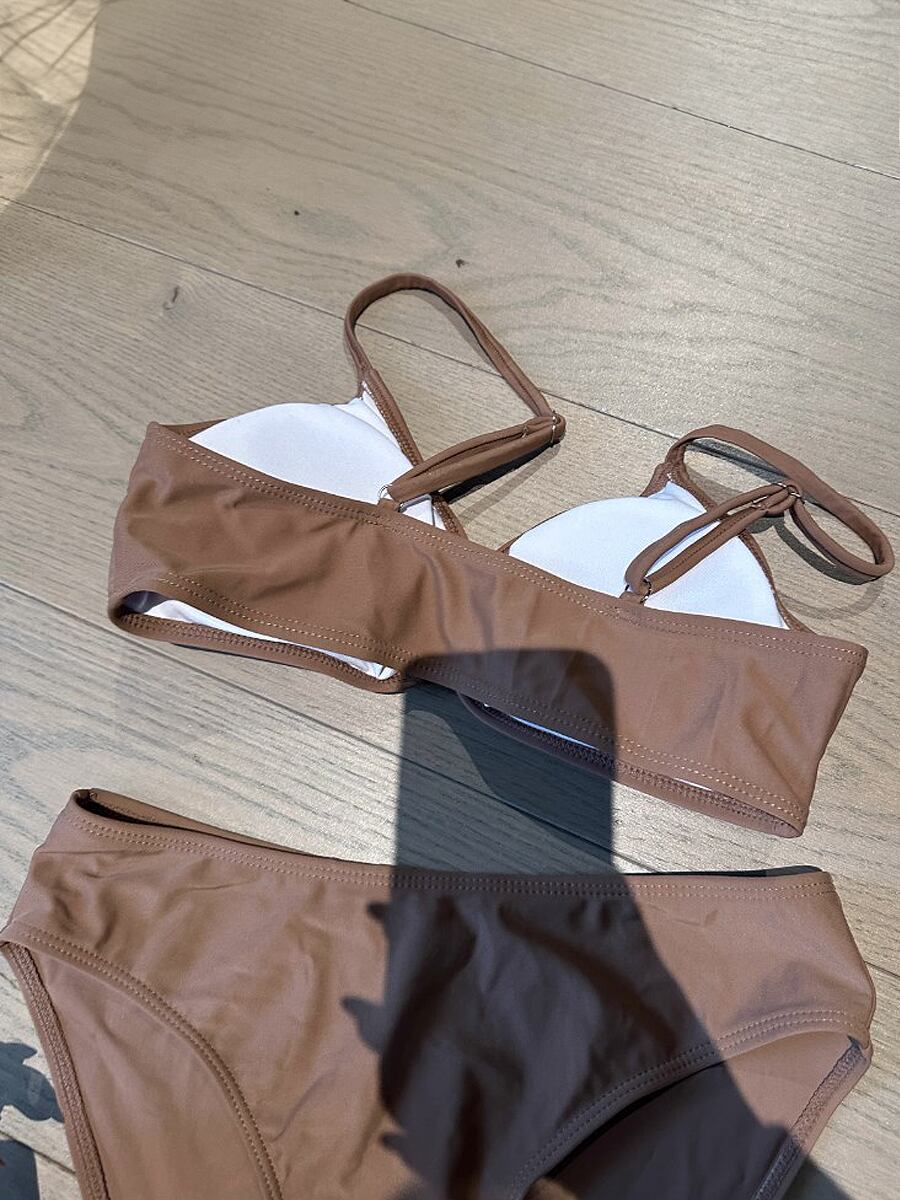 無地のホックレスキーホールビキニ水着上下とレースアップのラッシュガードのボレロにドロストのミニスカートの4点セットです。