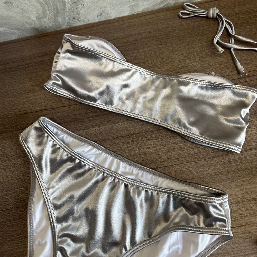 シルバーのラメ生地のホルターネックビキニ上下とロングパレオの3点セットです。