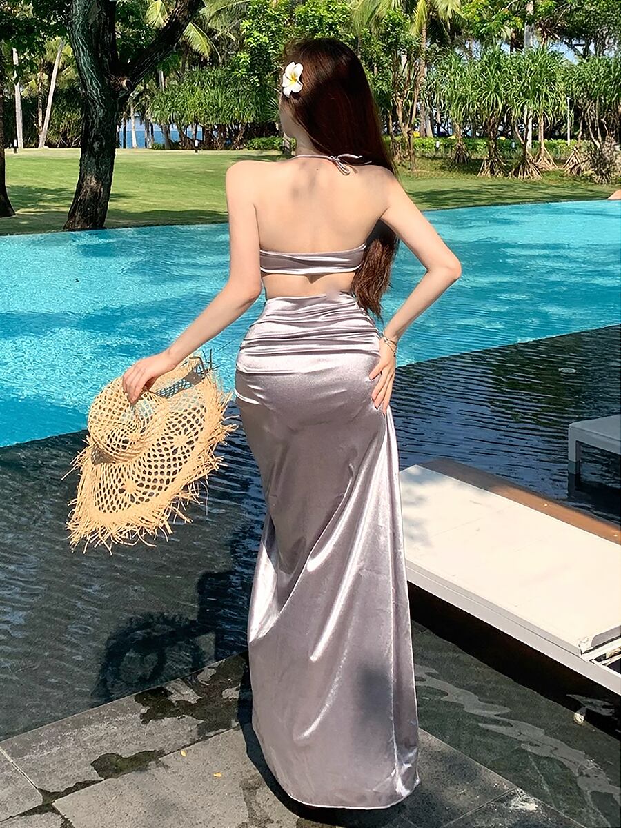 3点セット 水着 ラメ生地ホルターネックビキニ上下+ロングスカート ロングパレオ 銀色 シルバー パレオ ラメ生地 キラキラ ピカピカ セクシービキニ ビキニ 星モチーフ ヒトデモチーフ 星 ヒトデ 海星 ベーシック シンプル スイムウェア パッド付き パッド ワイヤーなし ノンワイヤー 大胆ビキニ 美脚 レトロ フェミニン セクシー 大人 おおしゃれ お洒落 女っぽ 個性的 レディース ホテル 温泉 海 ビーチ プール リゾート スタイルアップ 韓国 韓国コーデ 韓国ファッション