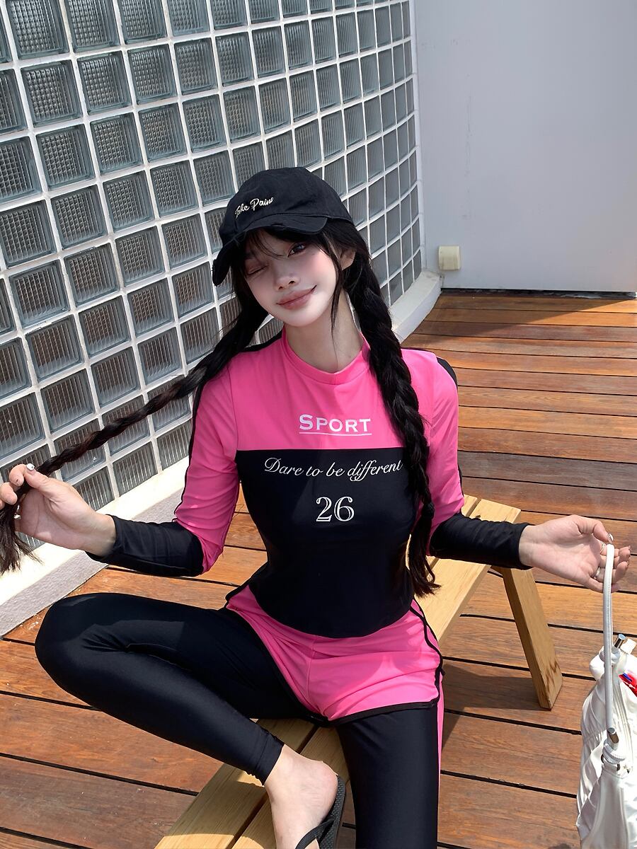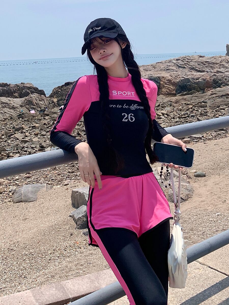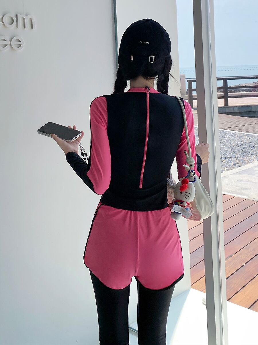 明るいローズピンクが映える長袖バックジップのトップスとロングパンツ、ショートパンツのお得な3点セットの水着です。