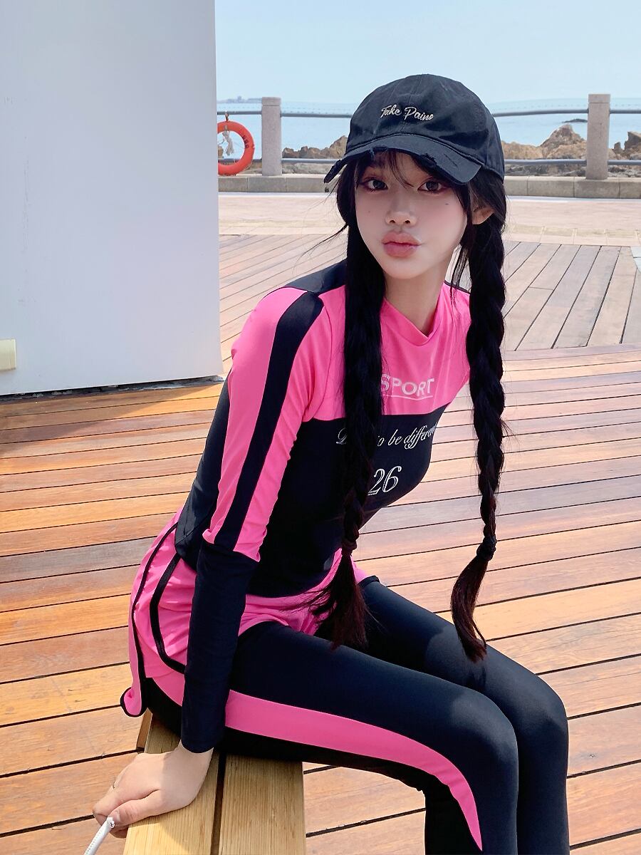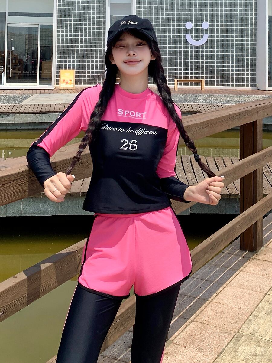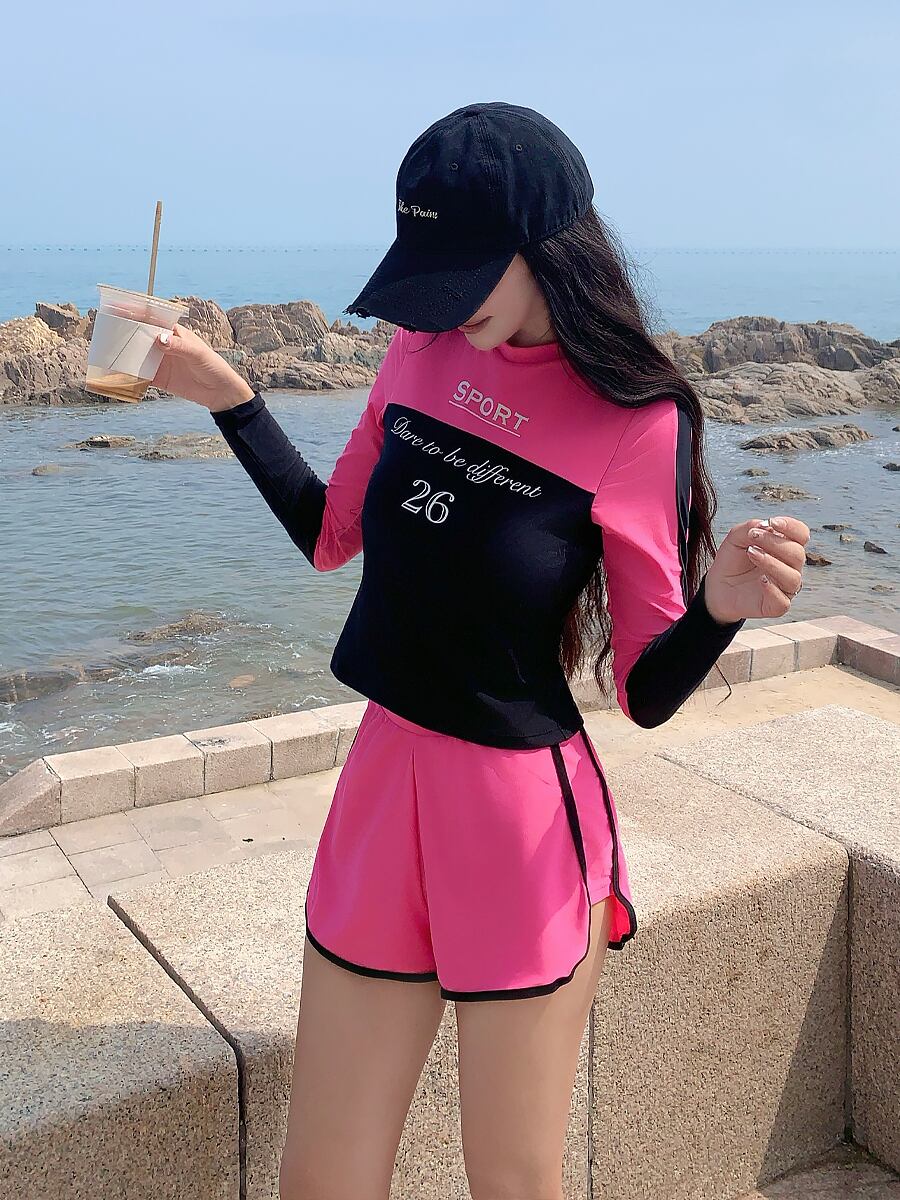 3点セット水着 長袖バックジップトップス+ロングパンツ+ショートパンツ スポーティセパレート水着 ビキニ セパレート ダイビング 長袖 猛暑対策 酷暑対策 ラッシュガード水着 ショートパンツ フレア フィットネス ピンク ブラック 黒 二の腕カバー 体型カバー スポーティ 水遊び きれいめ フェミニン かわいい パッド付き ワイヤーなし 伸縮性 セット かわいい 大人可愛い きれいめ セクシー おしゃれ スタイリッシュ 美脚 脚長 韓国コーデ 韓国ファション