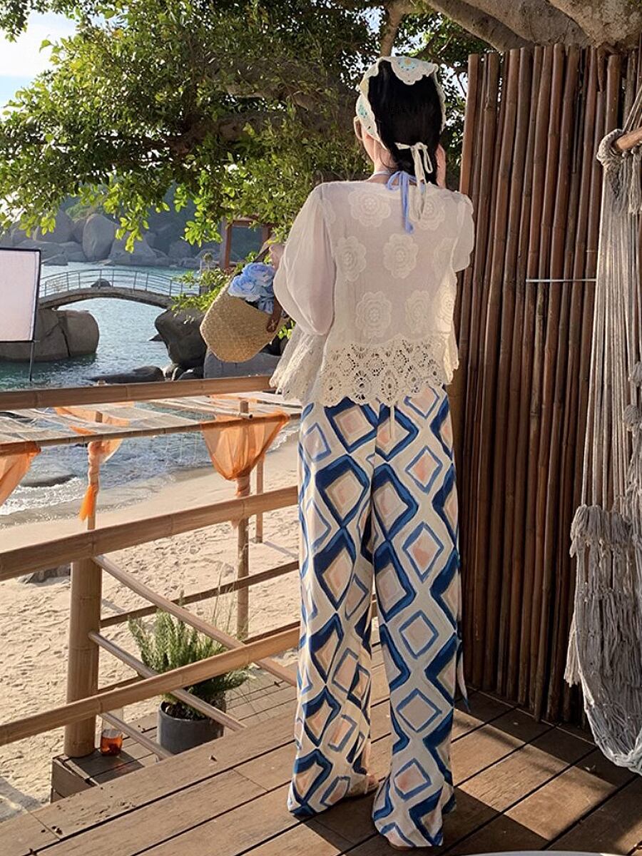 2点セット サマーニットキャミソールトップス+ロングスリットパンツ セットアップ 格子柄 チェック ブルー 青 花柄 リボン結び 胸パッド入り ロングパンツ スリット入りパンツ ウエストリボン ゆったりコーデ 楽ちんコーデ かわいい 大人可愛い きれいめ シンプル カジュアル 大人 上品 楽ちん おしゃれ お洒落 大人可愛い 大人女子 こなれ感 ラフ ガーリー ルーズ 春 夏 レディース 学生 韓国コーデ 韓国ファション ブルー 青 紺