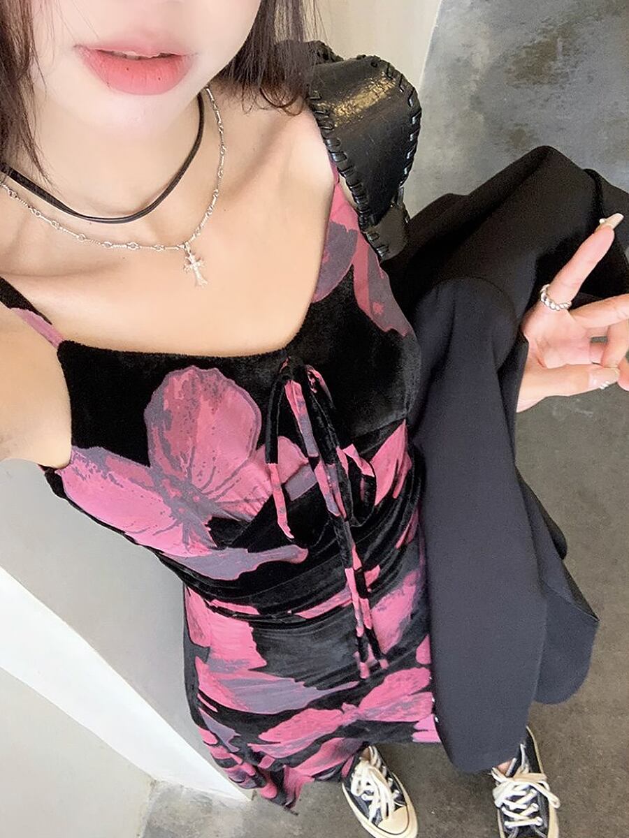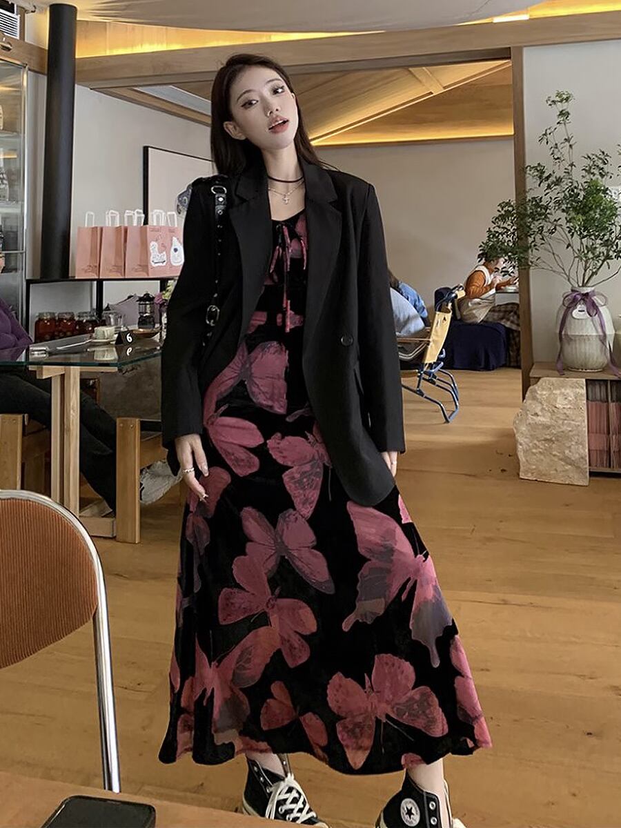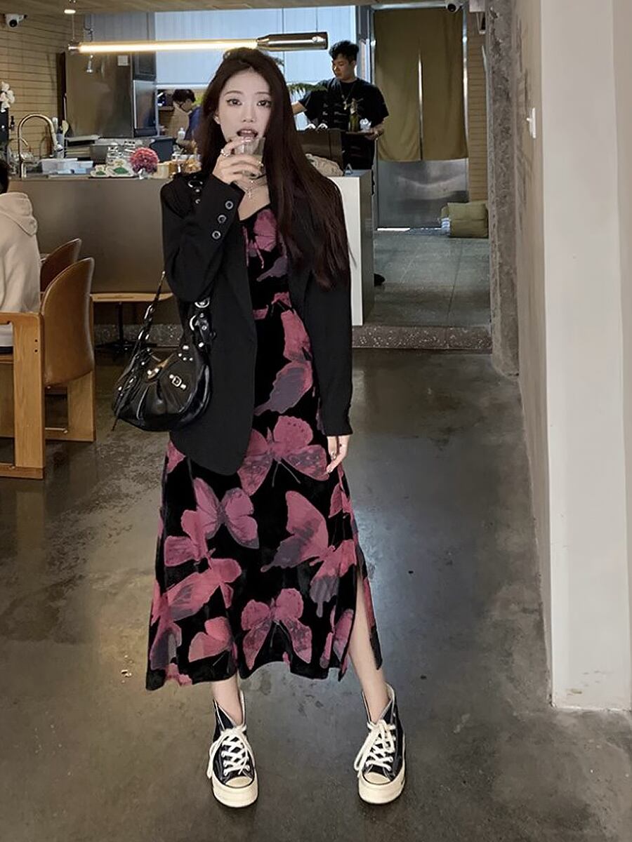 部分ベルベットキャミソールロングワンピース ワンピース キャミワンピ 夏ワンピ ロング ミモレ 蝶々柄 蝶柄 バタフライプリント ベロア ベルベット キャミソールワンピース ワンピース 肩出し ホテル レストラン パーティ 海 旅行 かわいい 大人可愛い きれいめ おしゃれ お洒落 かっこいい レトロ 大人女子 こなれ感 ラブリー キュート ガーリー 個性的 モード系 エレガント モダン 主役級 存在感 抜け感 韓国コーデ 韓国ファッション 黒 ブラック 紫 パープル