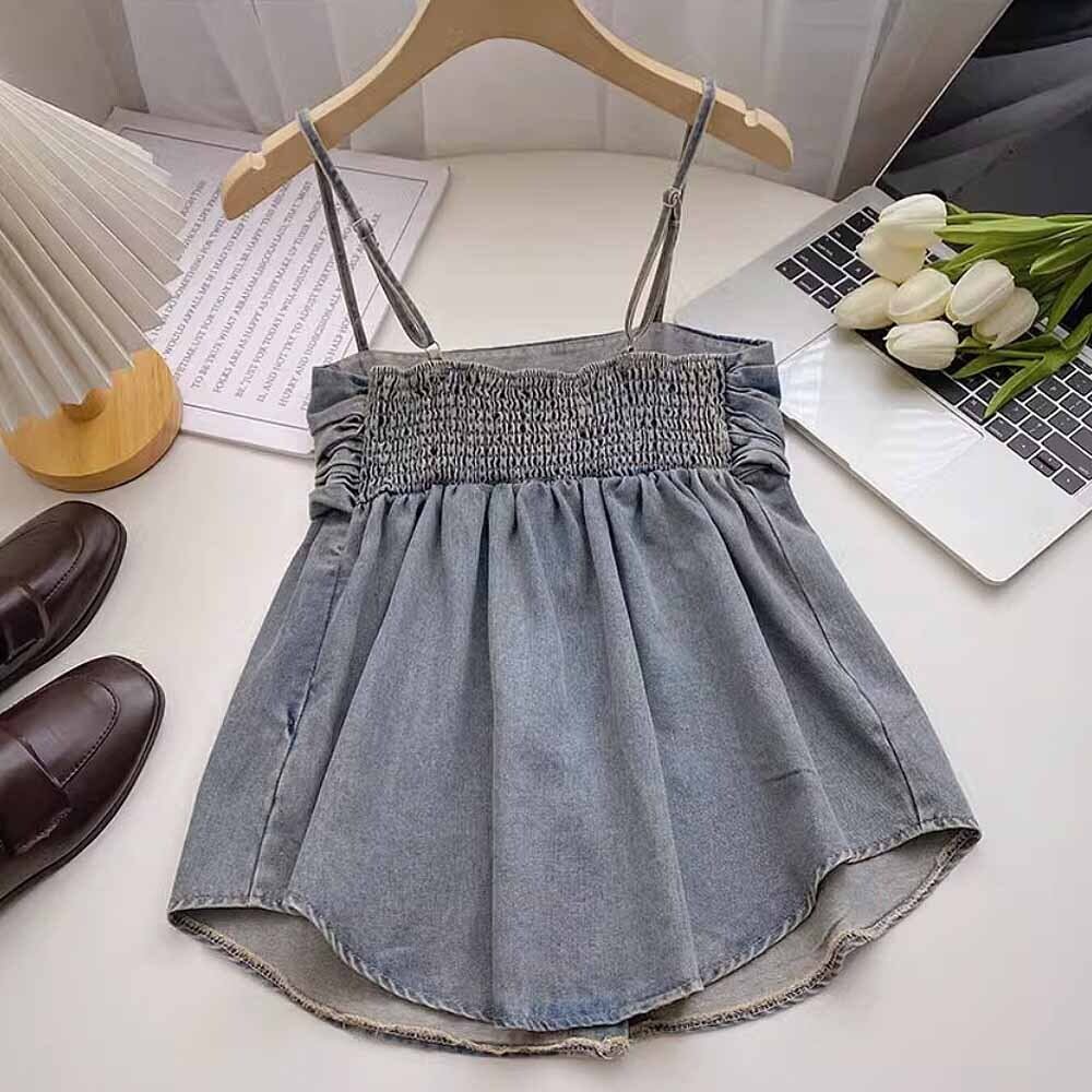 トップス デニム キャミソール チュニック 袖なし フリル フレア Aライン ギャザー バックシャーリング シャーリング デニムキャミソール ウォッシュ加工 かわいい おとなかわいい おしゃれ お洒落 大人可愛い 大人女子 クール スタイル かっこいい カジュアル エレガント セクシー ラブリー キュート 夏 レディース 女性用 学生 通学 デート お出かけ 休日 リゾート 海 プール ファッション スタイル モテ 体型カバー 韓国コーデ 韓国ファッション ブルー デニムブルー