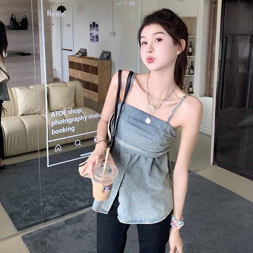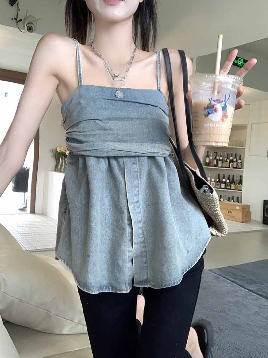 シャツとドッキングしたようなデニムキャミソールです。