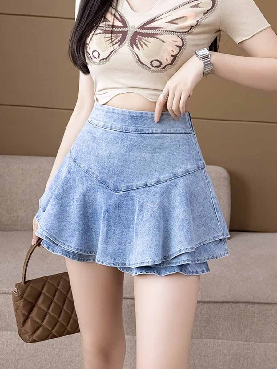 オーバーラップフレアデニムミニスカート キュロットスカート キュロット ショートパンツ ショーパン V字切替え デニムミニスカ フレア ビンテージ ヴィンテージ Aライン ウォッシャー加工 ハイウエスト ミニスカート 大人可愛い きれいめ カジュアル かっこいい レトロ 大人可愛い 大人女子 こなれ感 ラフ キュート ガーリー 個性的 レディース 学生 通学 デート お出かけ 公園デビュー リゾート 旅行 体系カバー 韓国コーデ 韓国ファッション ブルー 青