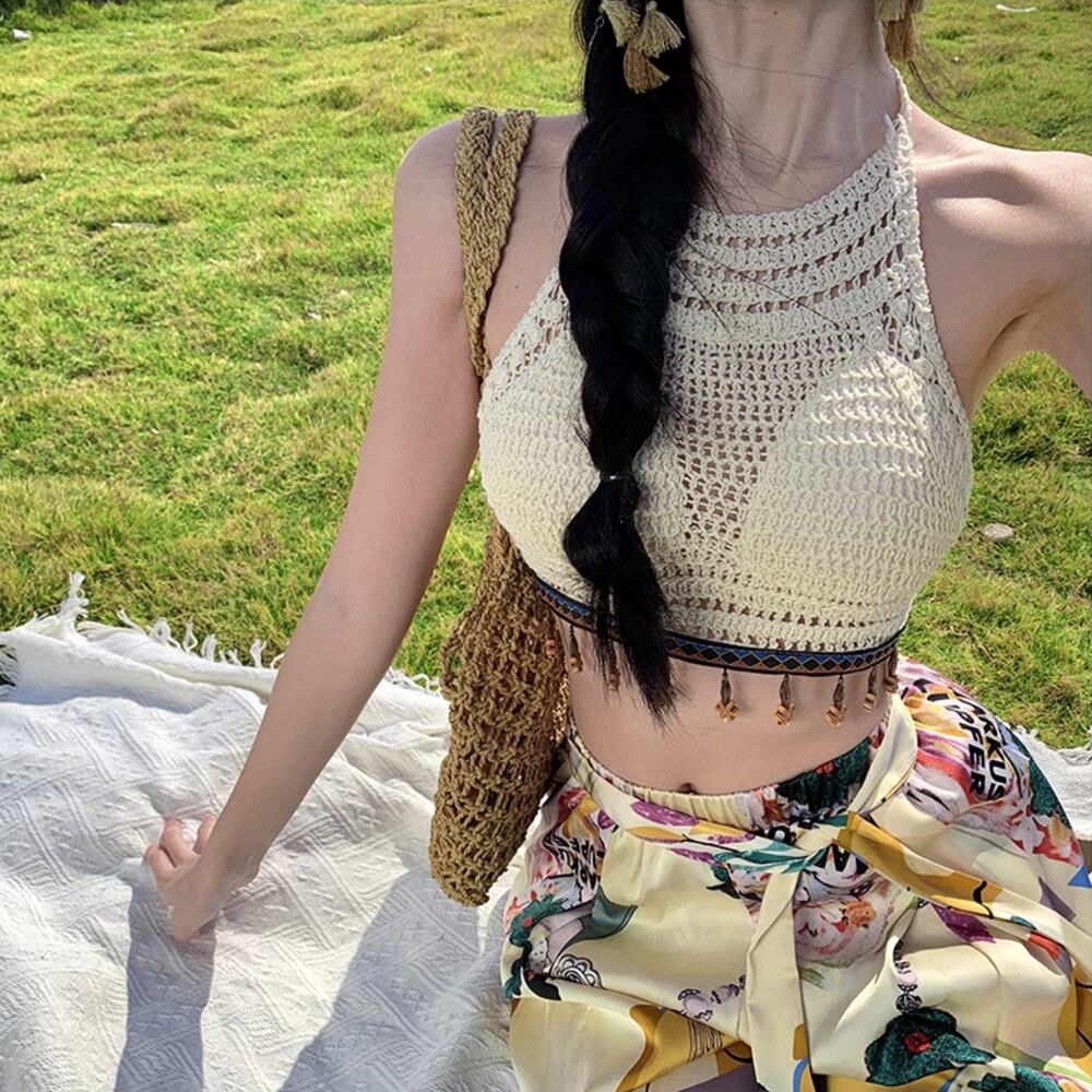 サマーニットのホルターネックキャミソールとスリット付きロングパンツの2点セットです。
