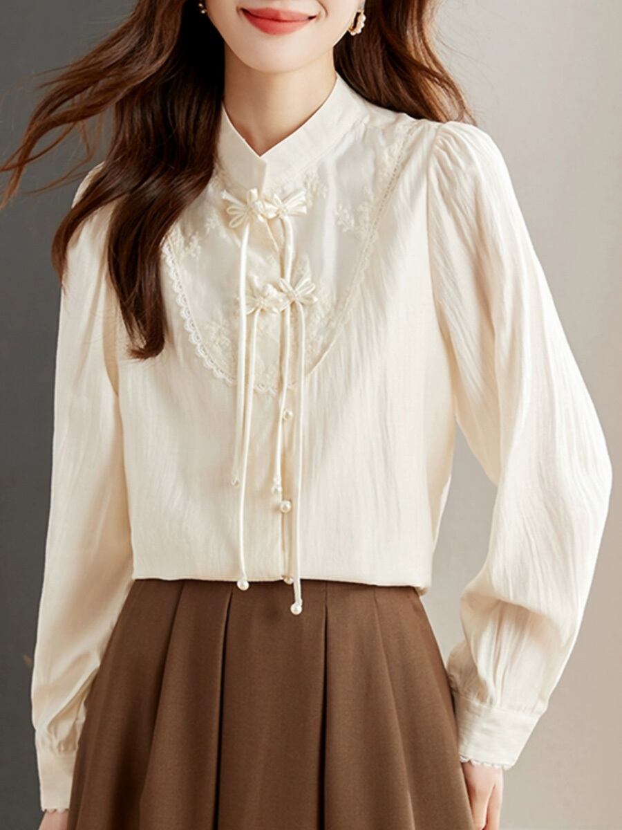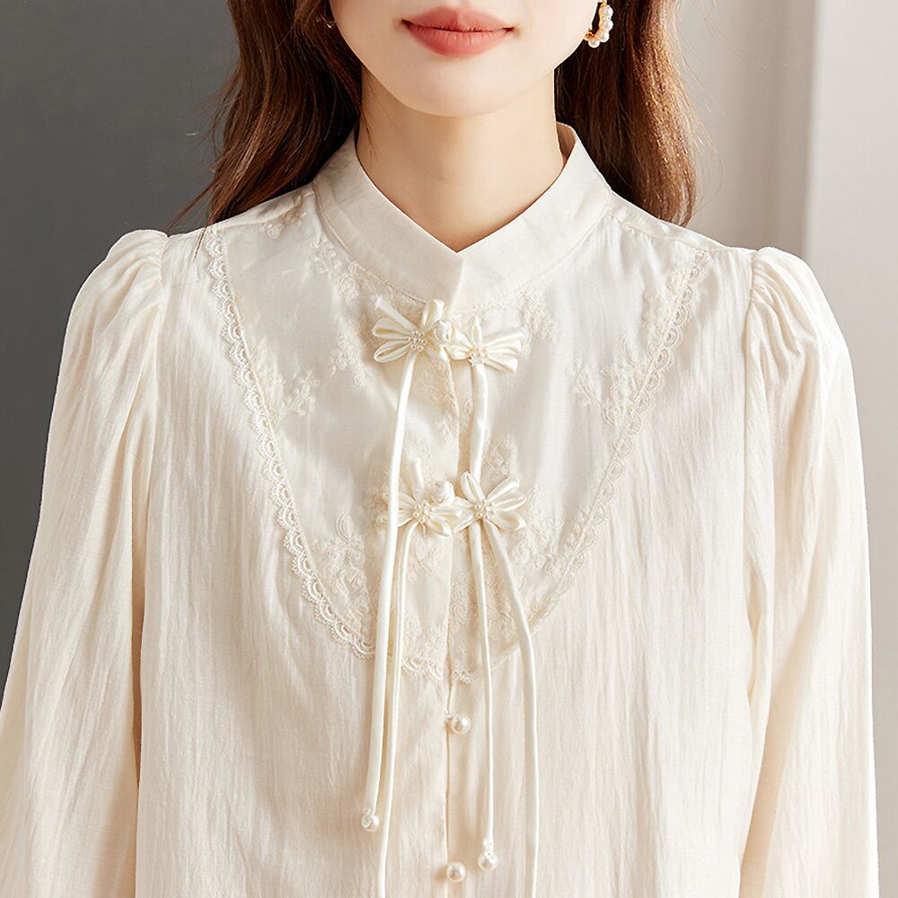 全2色 刺繍チャイナ風ブラウス 長袖 襟付き パンコウ フロッグボタン チャイナボタン 丈長め 個性的 かわいい 大人可愛い きれいめ 大人 おしゃれ ボーイッシュ ガーリー お洒落 かっこいい 大人女子 クール エレガント レディース 学生 通学 デート お出かけ 女子会 休日 リゾート 旅行 着回し 普段使い 重ね着 楽ちん カジュアル モテ チャイナコーデ 白 ホワイト アイボリー 中国服 中国コーデ