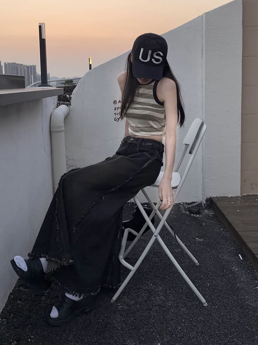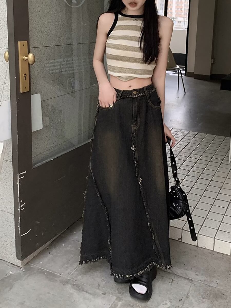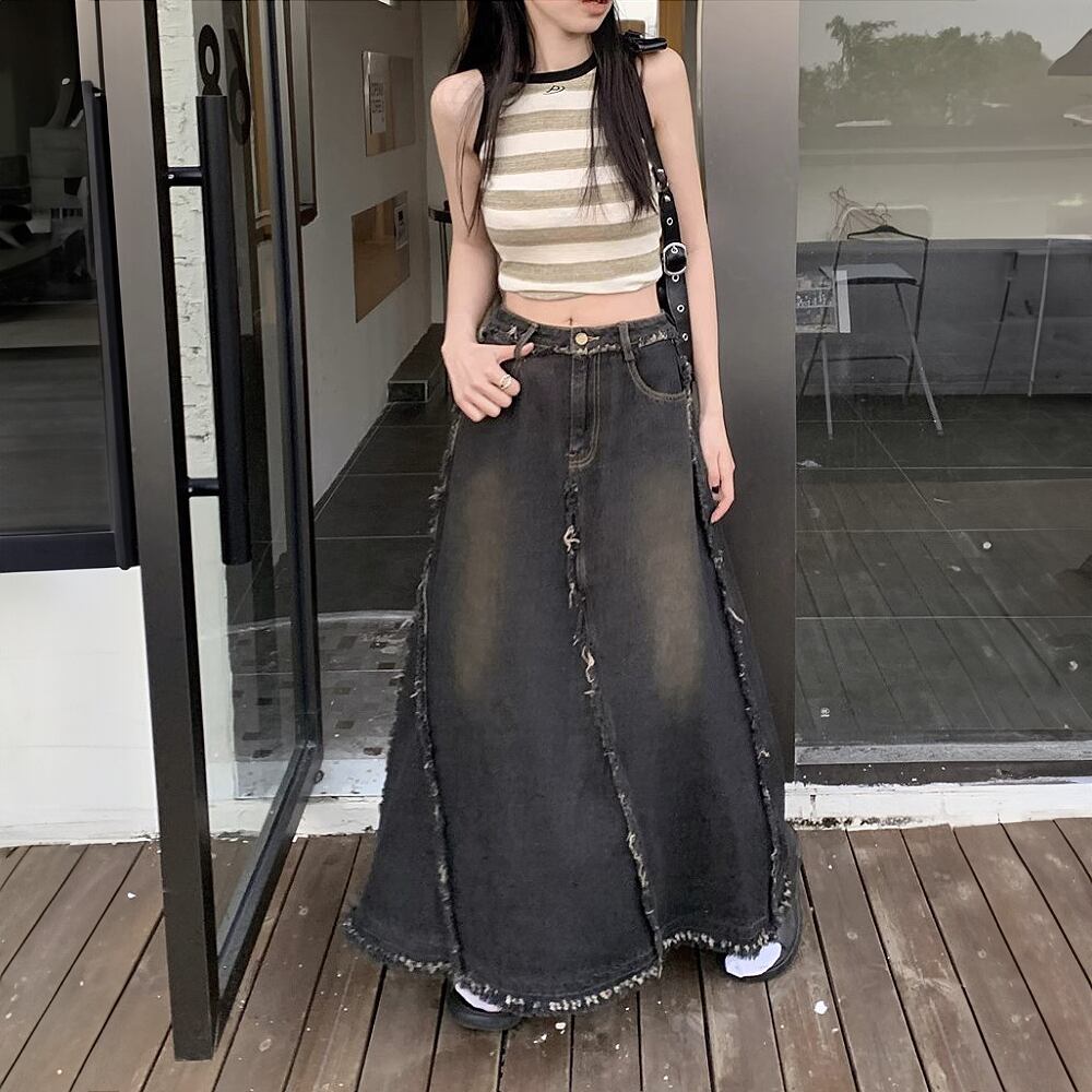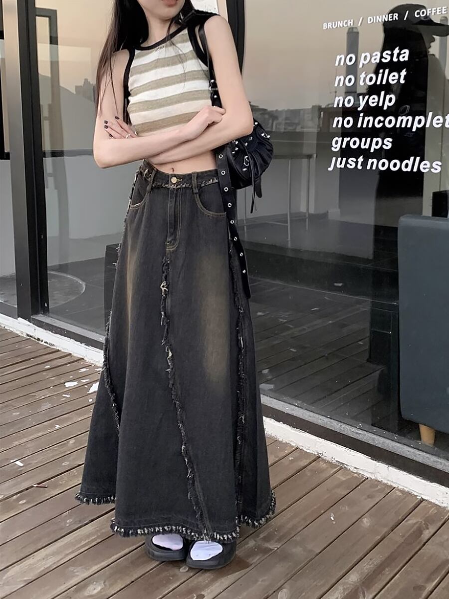 ブラックフリンジデニムロングスカート マキシデニム ビンテージ ヴィンテージ フレア ウォッシャー加工 ハイウエスト 斜め切替え ロングスカート オフコーデ フリンジ ダメージ加工 Aライン 大人可愛い きれいめ カジュアル かっこいい レトロ 大人可愛い 大人女子 こなれ感 ラフ キュート ガーリー 個性的 レディース 学生 通学 デート お出かけ 体系カバー 韓国コーデ 韓国ファッション 黒 ブラック