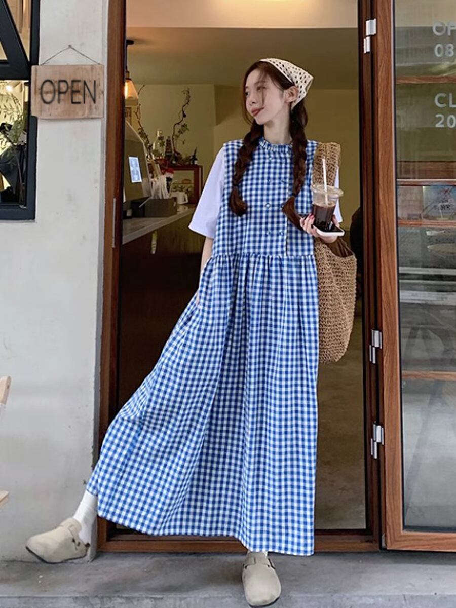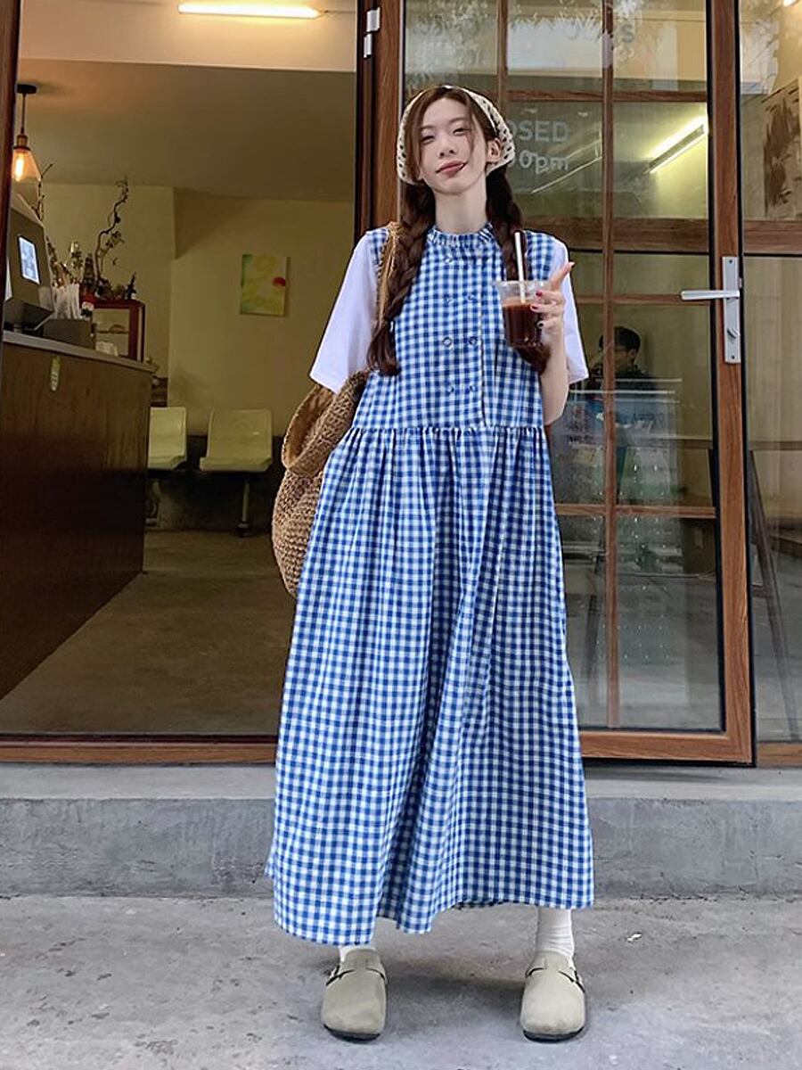 ブルーチェック柄ダブルジャンパースカート ノースリーブ ワンピース ジャンパースカート ジャンスカ ミモレ丈 ラウンドネック ハイウエスト ゆとりあり 楽ちん 締めつけ感なし かわいい 大人可愛い きれいめ シンプル おしゃれ お洒落 かっこいい レトロ 大人女子 こなれ感 ラブリー ガーリー 個性的 モード系 エレガント モダン 韓国コーデ 韓国ファッション チェック 格子柄 青 ブルー