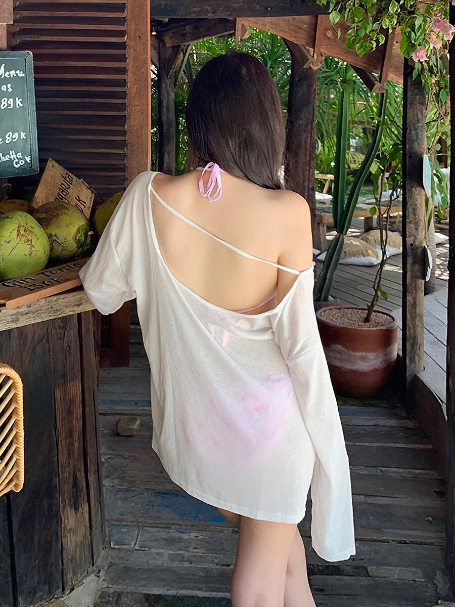 3点セット 水着 ビキニ さくらんぼ柄ビキニ上下+スリット付き長袖ラッシュガード ピンク 白 ホワイト チェリー チェリー柄 さくらんぼ柄 ホルターネック タイサイド 紐ビキニ ラッシュガード パッド付き ノンワイヤー 大きめスリット ざっくりプルオーバー Tシャツ オーバーサイズシャツ かわいい 大人可愛い 水遊び おしゃれ ラブリー キュート かっこいい レディース 女性用 ビーチ プール リゾート 体系カバー 美脚 脚長 スタイルアップ 美スタイル インスタ映え 韓国コーデ