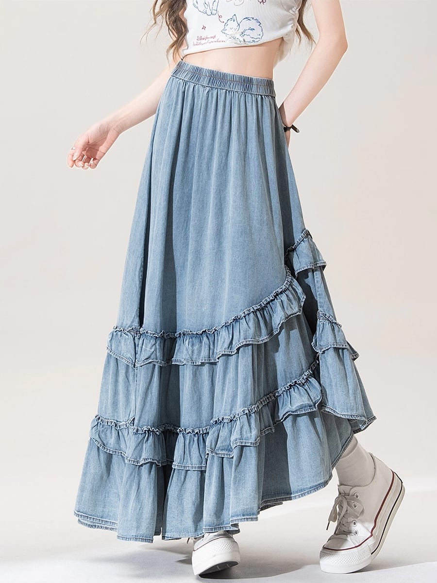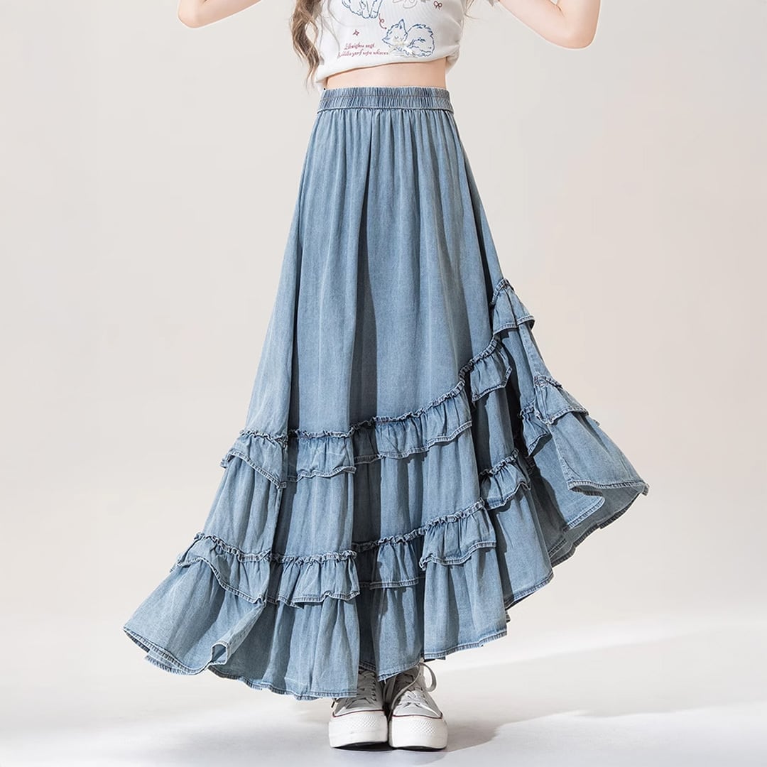 アシンメトリーデニムティアードロングスカート 斜めカット 段々フリルスカート 裾フリル ウォッシュ加工 ロングスカート ダメージ加工 切替えデザイン ウエスト楽ちん ウエストゴム フレアスカート フレア かわいい 大人可愛い きれいめ シンプル カジュアル 大人 上品 楽ちん おしゃれ お洒落 大人可愛い 大人女子 こなれ感 ラフ ガーリー ルーズ 春 夏 秋 レディース 学生 韓国コーデ 韓国ファション ブルー ライトブルー 青 デニムライトブルー