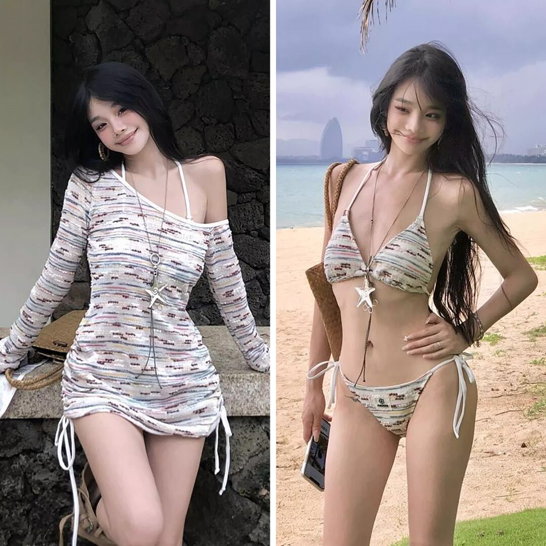 3点セット 水着 ビキニ マルチカラーボーダーホルターネックタイサイドビキニ上下+ルーズプルオーバー オーバーサイズラッシュガード マルチカラー サイドドロスト ラフ感 パッド付き ノンワイヤー ワイヤーなし ホルターネック タイサイド 紐ビキニ かわいい 大人可愛い シンプル 水遊び おしゃれ ラブリー キュート 個性的 かっこいい レディース 女性用 ママ ビーチ プール リゾート 体系カバー 美脚 脚長 スタイルアップ 美スタイル モテ インスタ映え 韓国コーデ